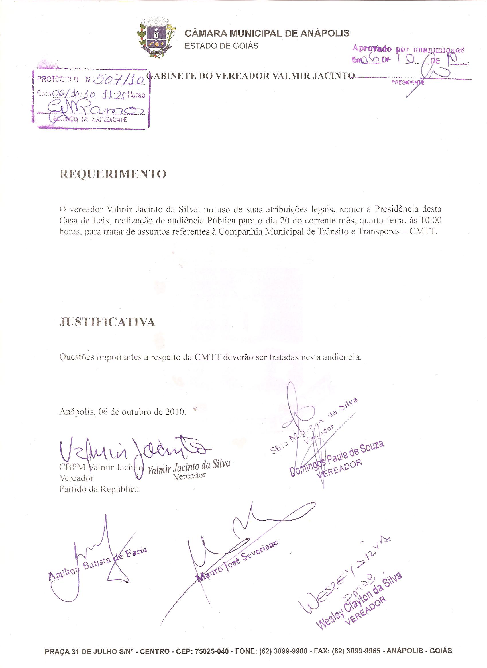 ![]() O VEREADOR VALMIR JACINTO DA SILVA, NO USO DE SUAS ATRIBUIÇÕES LEGAIS, REQUER Á PRESIDÊNCIA DESTA CASA DE LEIS, REALIZACÃO DE AUDIÊNCIA PÚBLICA PARA O DIA 20 DO CORRENTE MÊS, QUARTA-FEIRA, ÁS 10:00 HORAS, PARA TRATAR DE ASSUNTOS REFERENTES Á COMPANHIA MUNICIPAL DE TRÂNSITO E TRANSPORTE -CMTT.