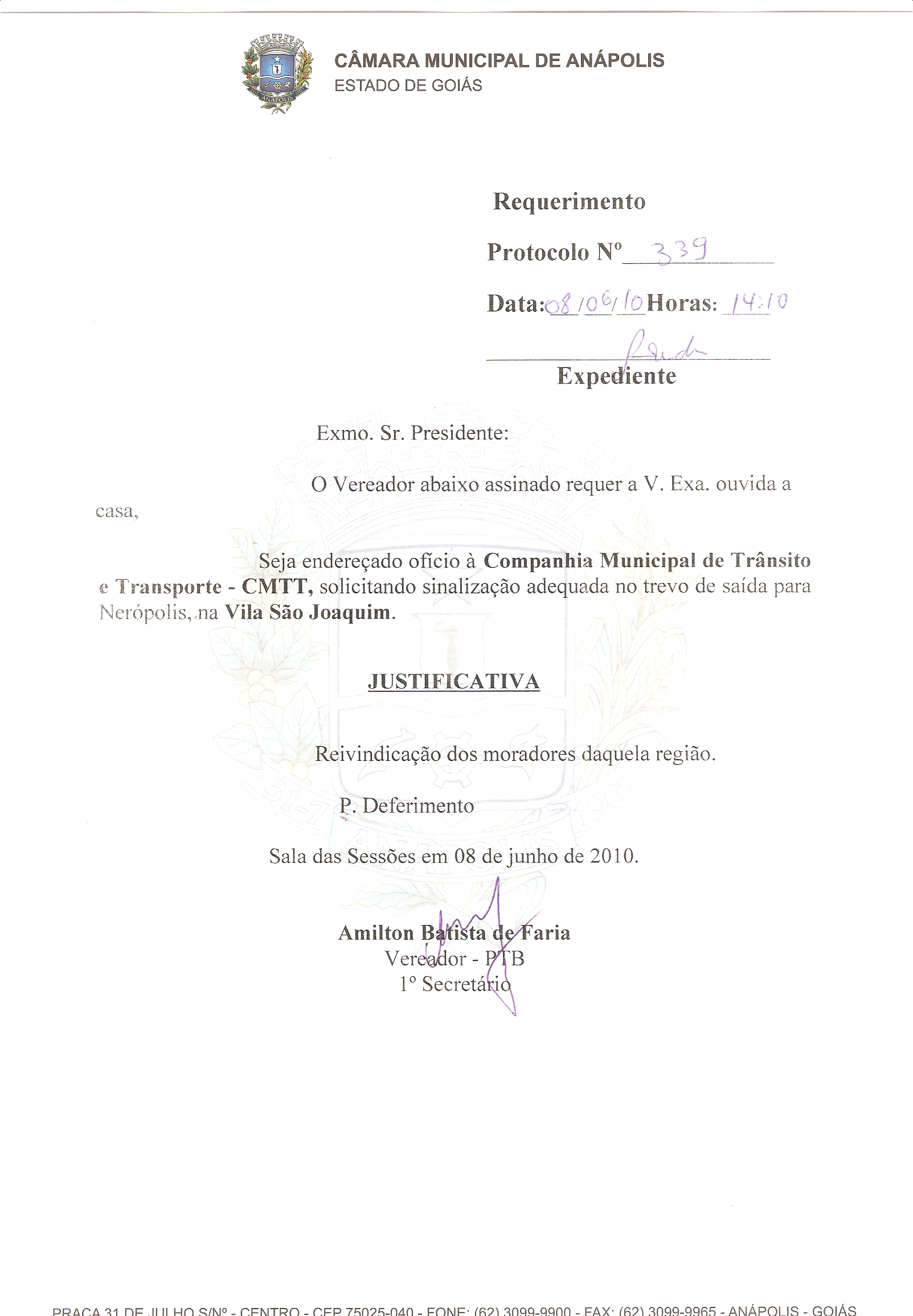 Ementa: O VEREADOR ABAIXO ASSINADO REQUER A V.EXA., OUVIDA A CASA, SEJA ENDEREÇADO OFÍCIO Á COMPANHIA MUNICIPAL DE TRÂNSITO E TRANSPORTE-CMTT, SOLICITANDO SINALIZAÇÃO ADEQUADA NO TREVO DE SAÍDA PARA NERÓPOLIS, NA VILA SÃO JOAQUIM.