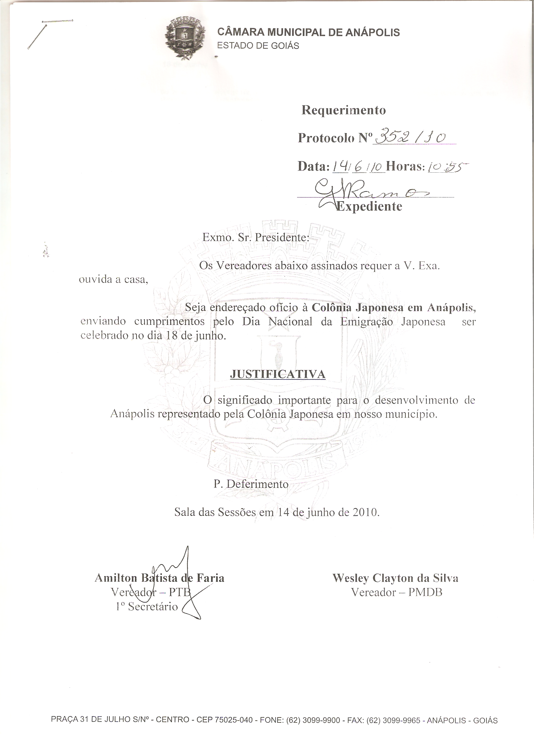 Ementa: OS VEREADORES ABAIXO ASSINADOS REQUER A V. EXA., OUVIDA A CASA, SEJA ENDEREÇADO OFÍCIO Á COLÔNIA JAPONESA EM ANÁPOLIS, ENVIADO CUMPRIMENTOS PELO DIA NACIONAL DA EMIGRAÇÃO JAPONESA SER CELEBRADO NO DIA 18 DE JUNHO.