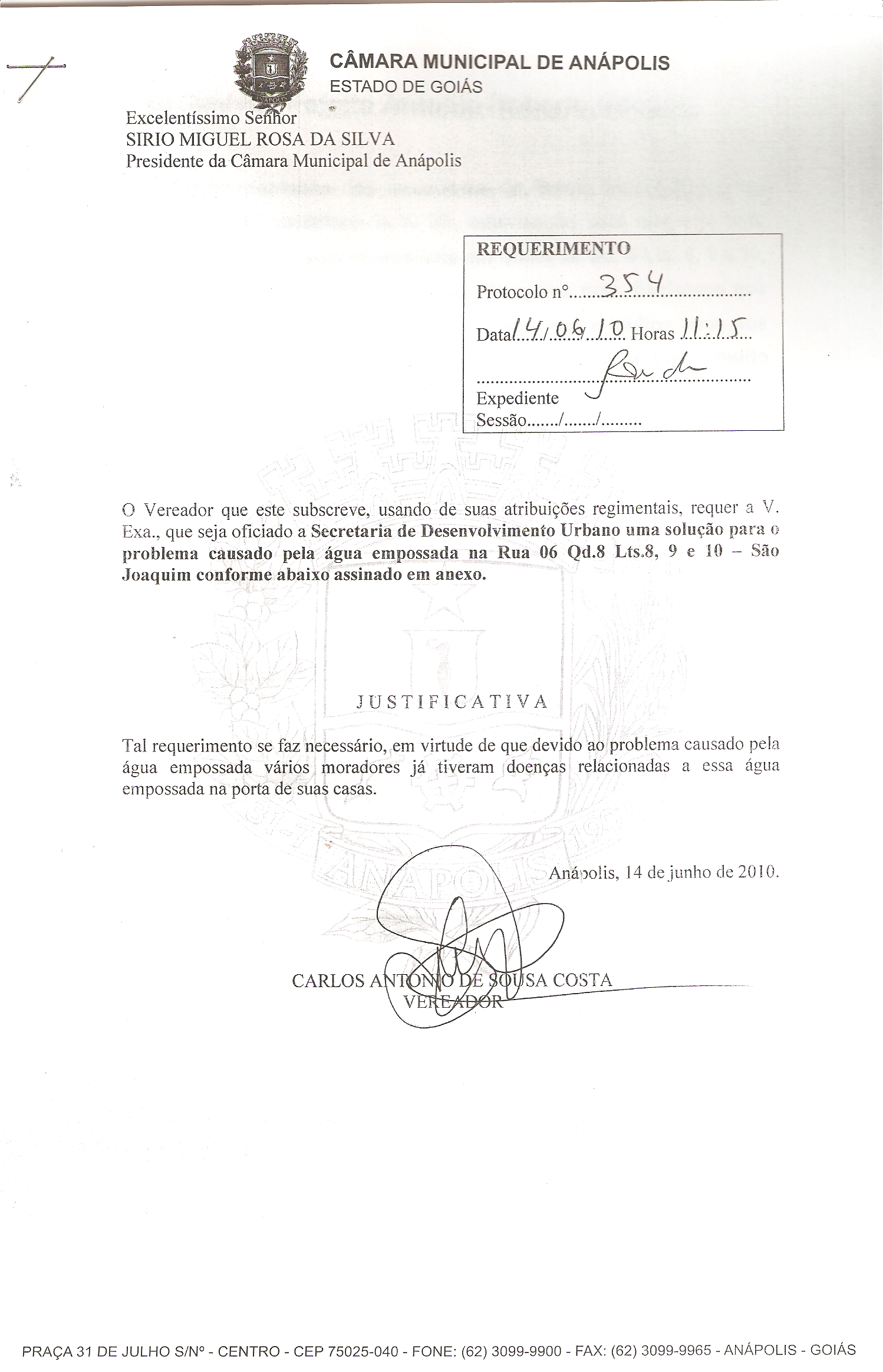 Ementa: O VEREADOR QUE ESTE SUBSCREVE, USANDO DE SUAS ATRIBUIÇÕES REGIMENTAIS, REQUER A V. EXA., QUE SEJA OFICIADO A SECRETARIA DE DESENVOLVIMENTO URBANO UMA SOLUÇÃO PARA O PROBLEMA CAUSADO PELA ÁGUA EMPOSSADA NA RUA 06 QD.8, LTS.8,9 E 10- SÃO JOAQUIM CONFORME ABAIXO ASSINADO EM ANEXO.
