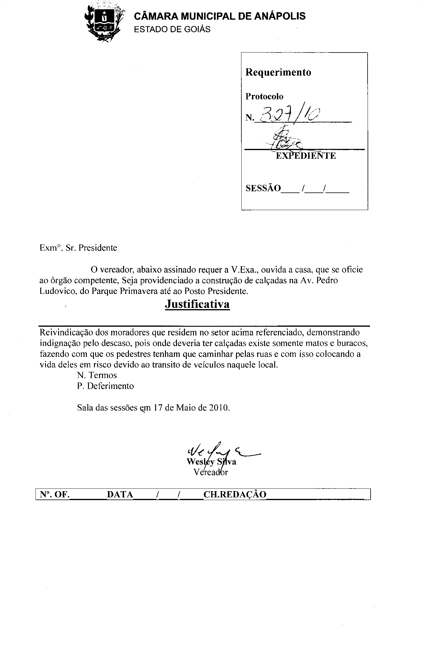 Ementa: O VEREADOR, ABAIXO ASSINADO REQUER A V. EXA., OUVIDA A CASA, QUE SE OFÍCIE AO ÓRGÃO COMPETENTE, SEJA PROVIDENCIADO A CONTRUÇÃO DE CALÇADAS NA AV.PEDRO LUDOVICO, DO PARQUE PRIMAVERA ATÉ AO POSTO PRESIDENTE.