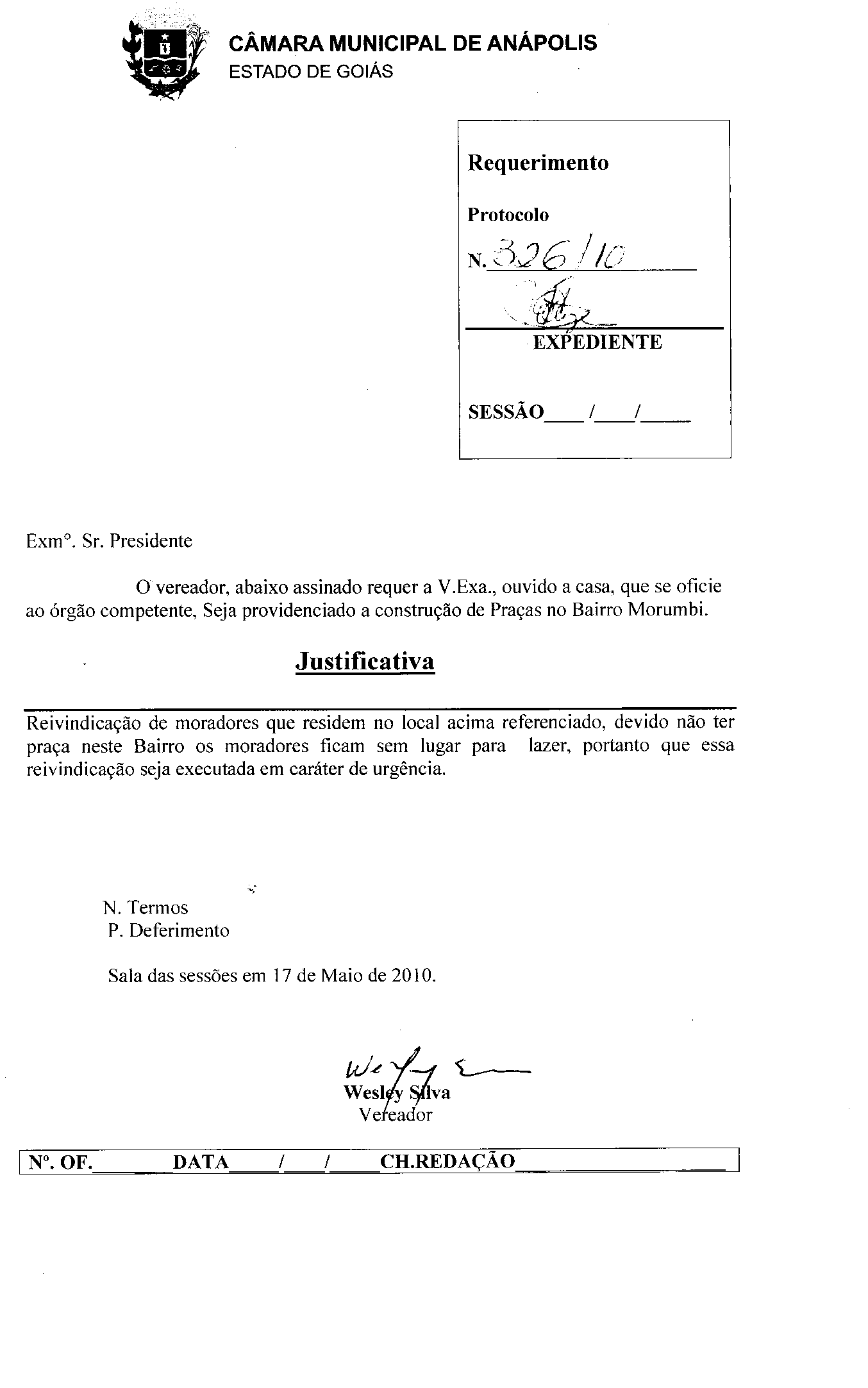 Ementa: O VEREADOR, ABAIXO ASSINADO REQUER A V.EXA., OUVIDO A CASA, QUE SE OFÍCIE AO ÓRGÃO COMPETENTE, SEJA PROVIDENCIADO A CONSTRUÇÃO DE PRAÇAS NO BAIRRO MORUMBI.