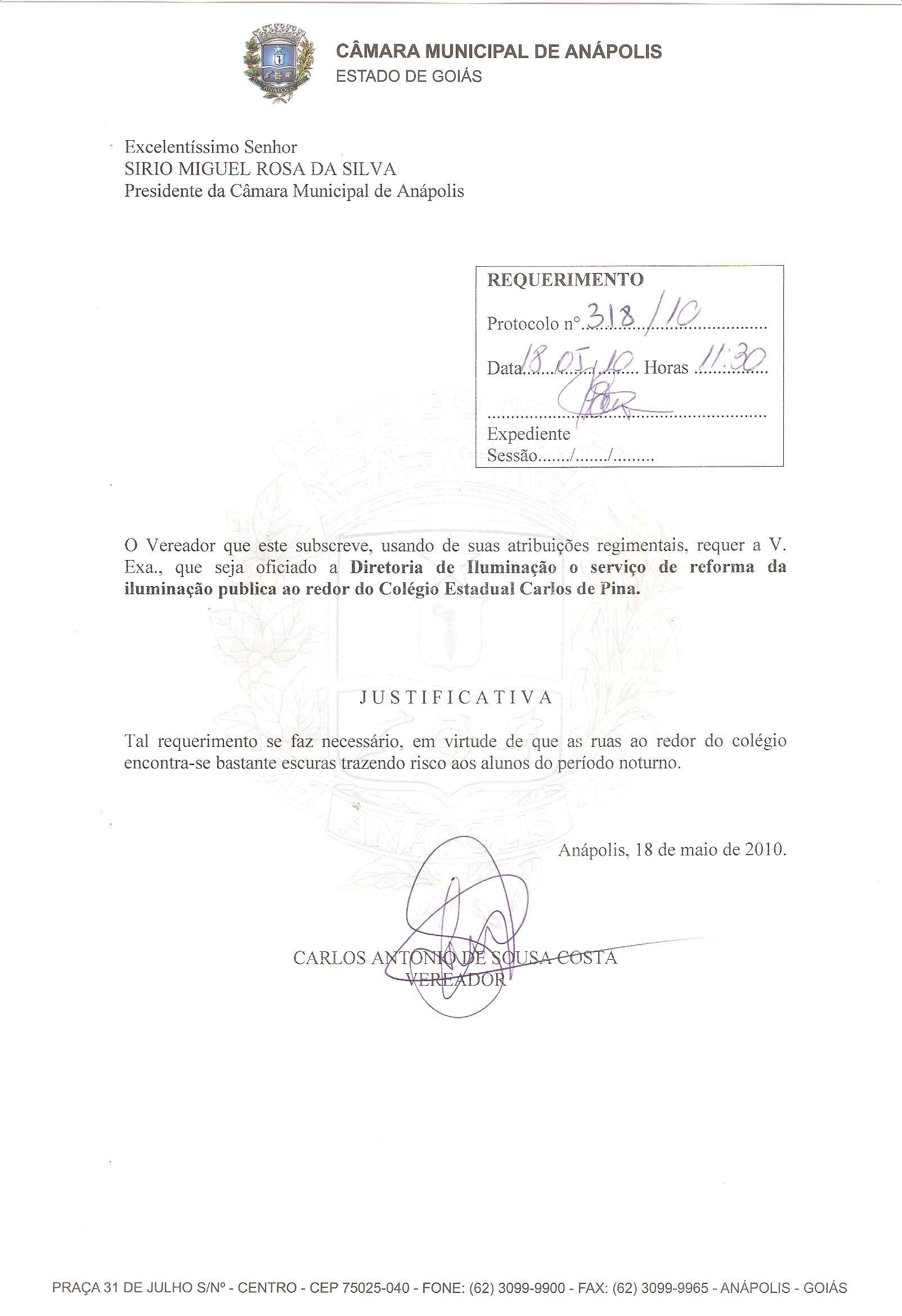 Ementa: O VEREADOR QUE ESTE SUBSCREVE, USANDO DE SUAS ATRIBUIÇÕES REGIMENTAIS, REQUER A V. EXA., QUE SEJA OFÍCIADO A DIRETORIA DE ILUMINAÇÃO O SERVIÇO DE REFORMA ILUMINAÇÃO PÚBLICA AO REDOR DO COLÉGIO ESTADUAL CARLOS DE PINA.