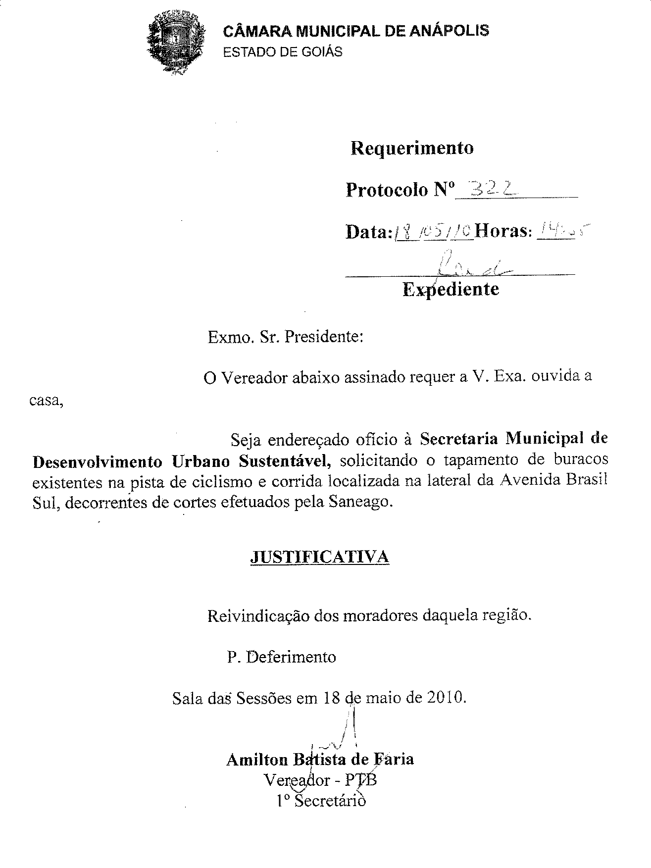 Ementa: O VEREADOR ABAIXO ASSINADO REQUER A V. EXA., OUVIDA A CASA, SEJA ENDEREÇADO OFÍCIO Á SECRETARIA MUNICIPAL DE DESENVOLVIMENTO URBANO SUSTENTÁVEL, SOLICITANDO O TAPAMENTO DE BURACOS EXISTENTES NA PISTA DE CICLISMO E CORRIDA LOCALIZADA NA LATERAL DA AVENIDA BRASIL SUL, DECORRENTES DE CORTES EFETUADOS PELA SANEAGO.