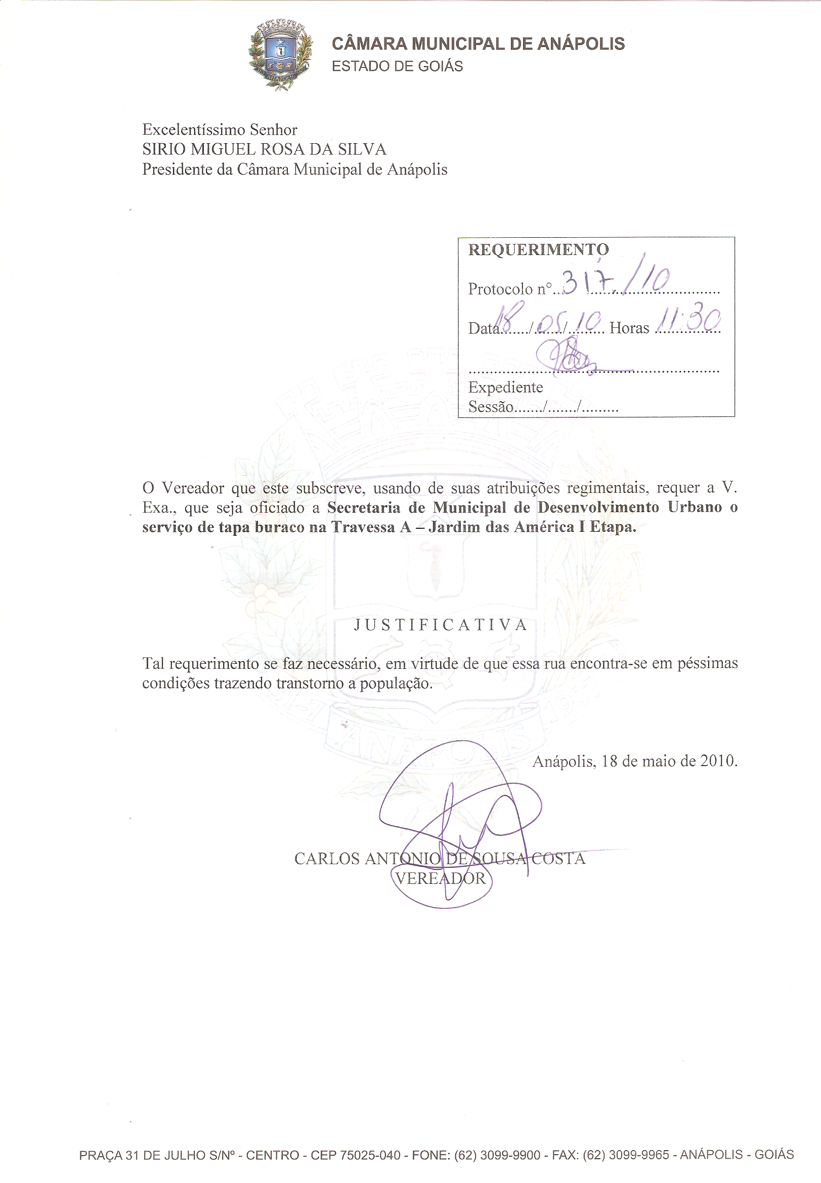 Ementa: O VEREADOR QUE ESTE SUBSCREVE, USANDO DE SUAS ATRIBUIÇÕES REGIMENTAIS, REQUER A V. EXA., QUE SEJA OFÍCIADO A SECRETARIA MUNICIPAL DE DESEVOLVIMENTO URBANO O SERVIÇO DE TAPA BURACO NA TRAVESSA A- JARDIM DAS AMERICA L ETAPA.