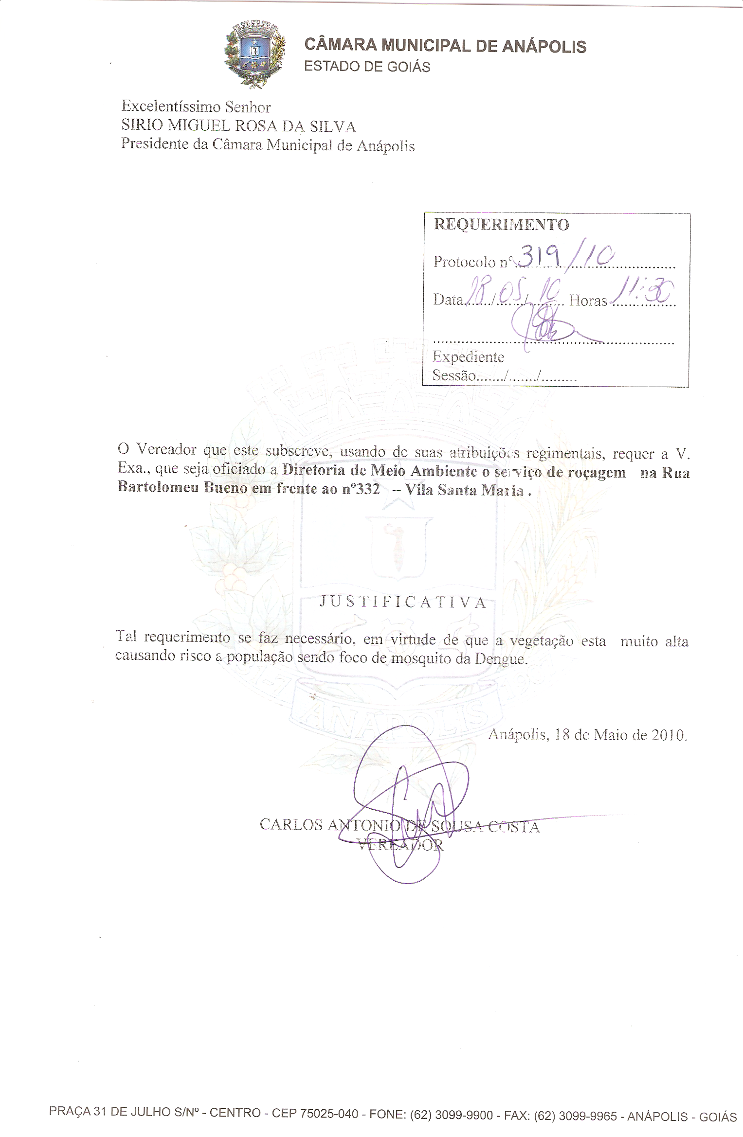 Ementa: O VEREADOR QUE SUBSCREVE, USANDO DE SUAS ATRIBUIÇÕES REGIMENTAIS, REQUER A V. EXA., QUE SEJA OFÍCIADO A DIRETORIA DE MEIO AMBIENTE O SERVIÇO DE ROÇAGEM NA RUA BARTOLOMEU BUENO EM FRENTE AO Nº332-VILA SANTA MARIA.