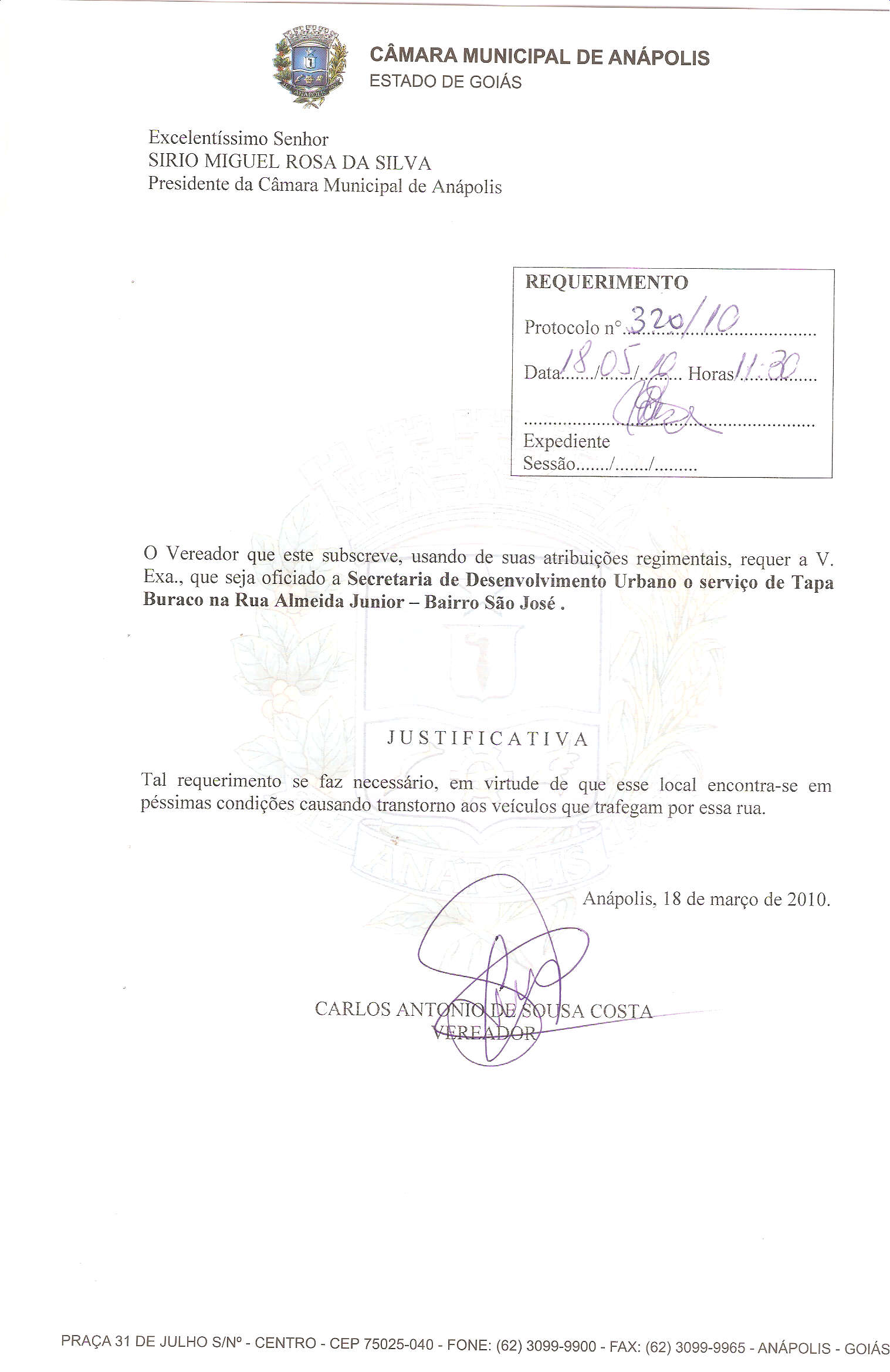 Ementa: O VEREADOR QUE ESTE SUBSCREVE, USANDO DE SUAS ATRIBUIÇÕES REGIMENTAIS,REQUER A V. EXA., QUE SEJA OFICIADO A SECRETARIA DE DESENVOLVIMENTO URBANO O SERVIÇO DE TAPA BURACO NA RUA ALMEIDA JUNIOR-BAIRRO SÃO JÓSÉ.