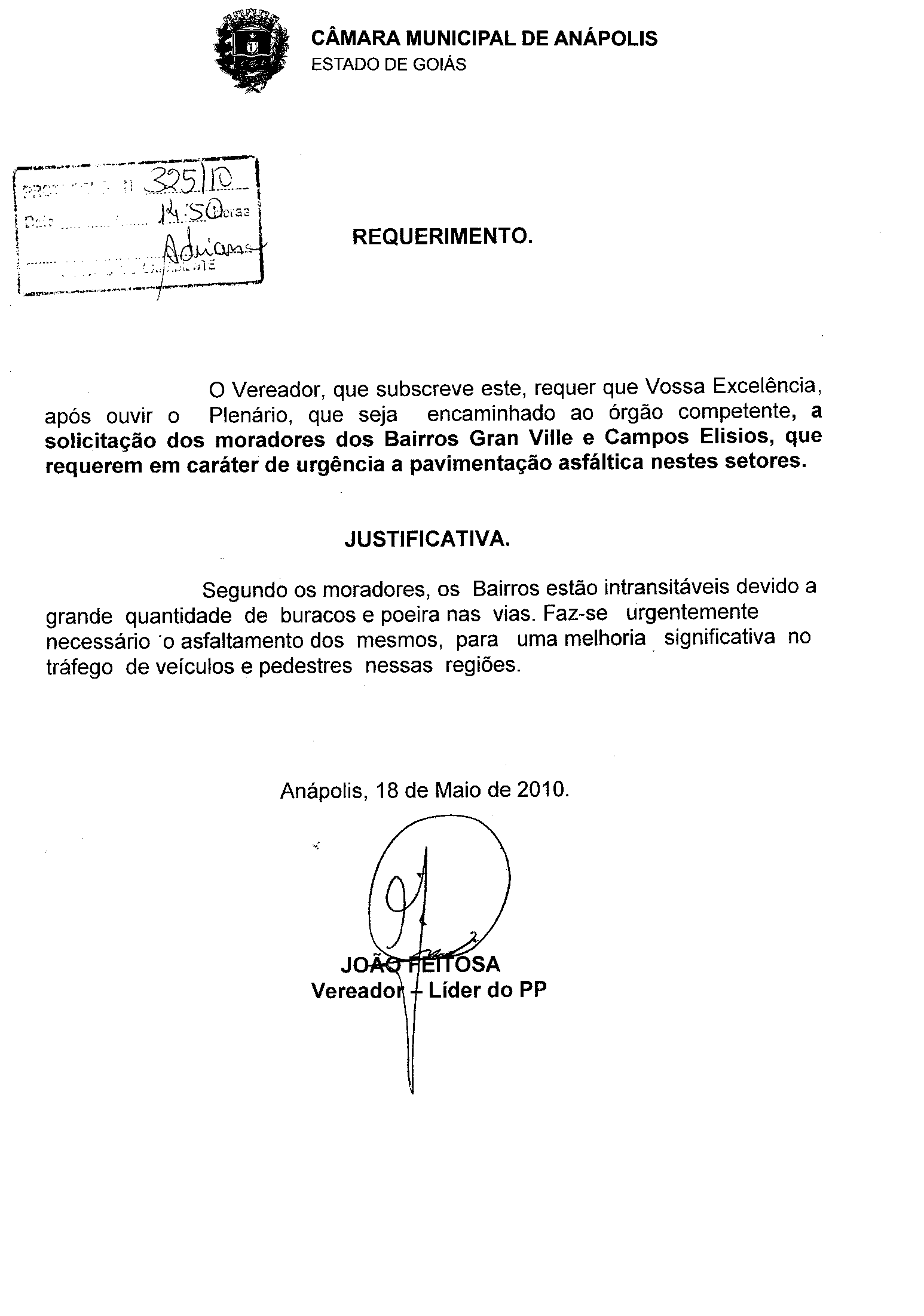 Ementa: O VEREADOR, QUE SUBSCREVE ESTE, REQUER QUE VOSSA EXCELÊNCIA, APÓS OUVIR O PLENÁRIO, QUE SEJA ENCAMINHADO AO ÓRGÃO COMPETENTE, A SOLICITAÇÃO DOS MORADORES DOS BAIRRO GRAN VILLE E CAMPOS ELISIOS, QUE REQUEREM EM CARÁTER DE URGÊNCIA A PAVIMENTAÇÃO ASFÁLTICA NESTE SETORES.