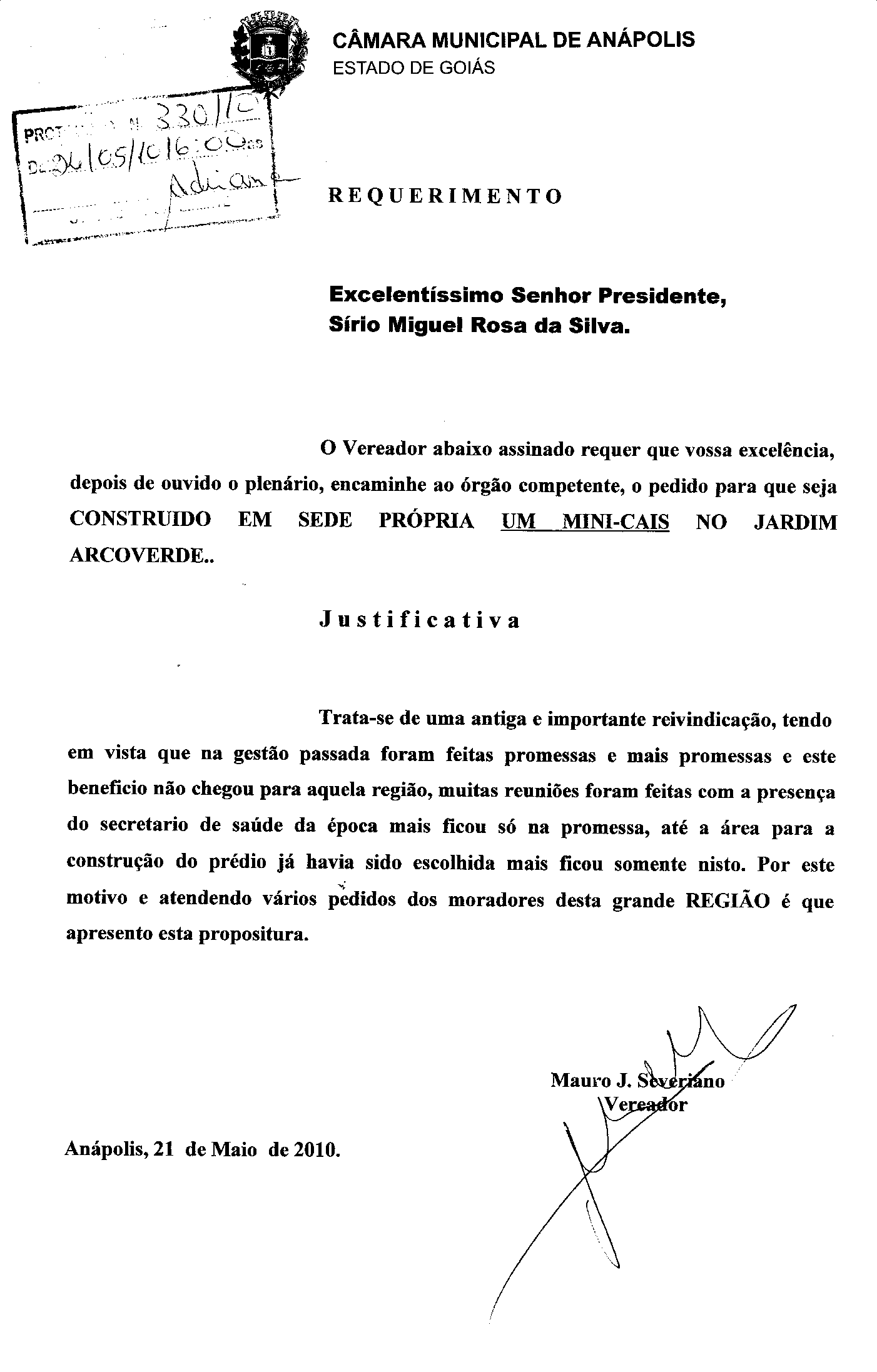 Ementa: O VEREADOR ABAIXO ASSINADO REQUER QUE VOSSA EXCELÊNCIA, DEPOIS DE OUVIDO O PLENÁRIO, ENCAMINHE AO ÓRGÃO COMPETENTE, O PEDIDO PARA QUE SEJA CONSTRUINDO EM SEDE PRÓPRIA UM MINI-CAIS NO JARDIM ARCO VERDE.