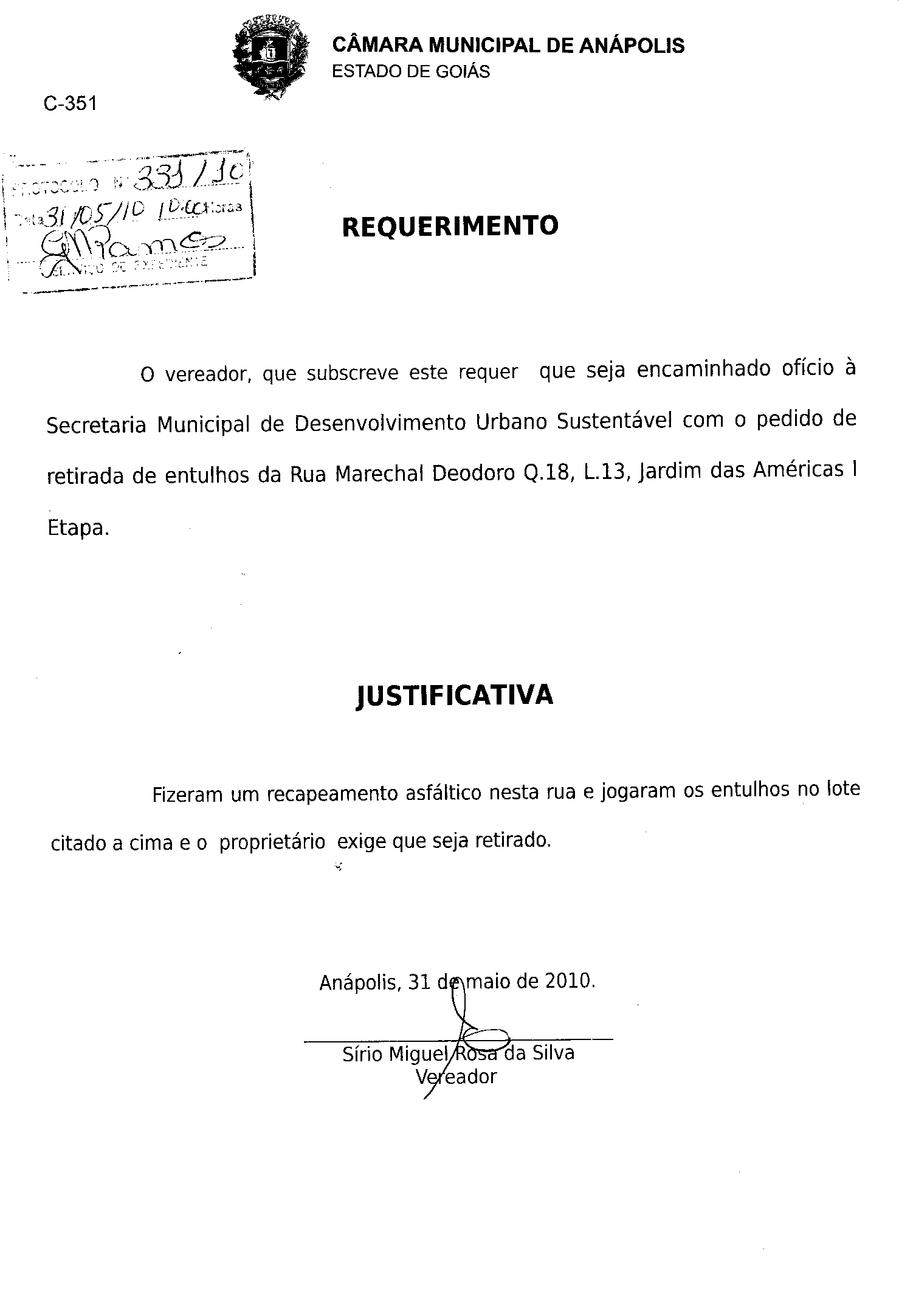 Ementa: O VEREADOR, QUE SUBSCREVE ESTE REQUER QUE SEJA ENCAMINHADO OFÍCIO Á SECRETARIA MUNICIPAL DE DESEVOLVIMENTO URBANO SUSTENTÁVEL COM O PEDIDO DE RETIRADA DE ENTULHOS DA RUA MARECHAL DEODORO QD.18, LT.13, JARDIM DAS AMÉRICAS L ETAPA.
