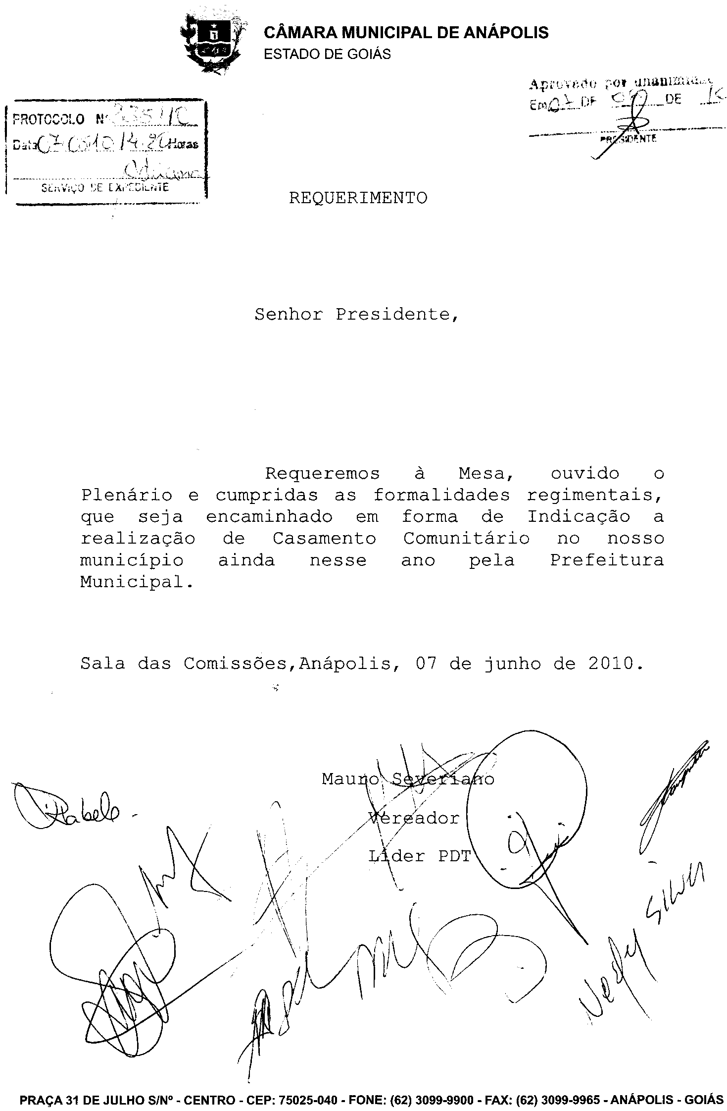 Ementa: REQUEREMOS Á MESA, OUVIDO O PLENÁRIO E CUMPRIDAS AS FORMALIDADE REGIMENTAIS, QUE SEJA ENCAMINHADO EM FORMA DE INDICAÇÃO A REALIZAÇÃO DE CASAMENTO COMUNITÁRIO NO NOSSO MUNICIPIO AINDA NESSE ANO PELA PREFEITURA MUNICIPAL.