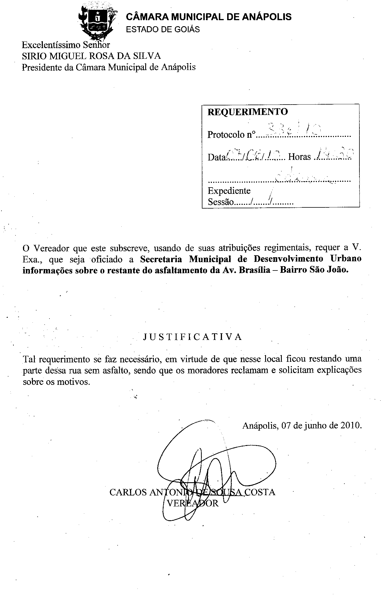 Ementa: O VEREADOR QUE ESTE SUBSCREVE, USANDO DE SUAS ATRIBUIÇÕES, REQUER A V. EXA., QUE SEJA OFÍCIADO A SECRETARIA MUNICIPAL DE DESENVOLVIMENTO URBANO INFORMAÇÕES SOBRE O RESTANTE DO ASFALTAMENTO DA AV. BRASILIA- BAIRRO SÃO JOÃO.