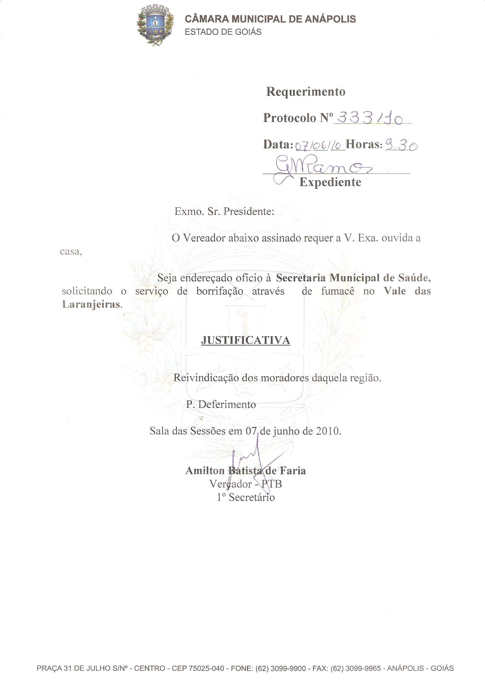 Ementa: O VEREADOR ABAIXO ASSINADO REQUER A V. EXA.,OUVIDA A CASA, SEJA ENDEREÇADA OFÍCIO Á SECRETARIA MUNICIPAL DE SAÚDE, SOLICITANDO O SERVIÇO DE BORRIFAÇÃO ATRAVÉS DE FUMACÊ NO VALE DAS LARANJEIRAS.