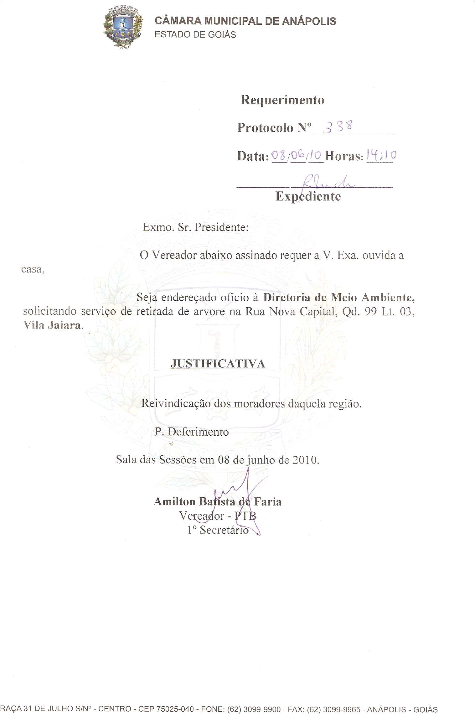 Ementa: O VEREADOR ABAIXO ASSINADO REQUER A V. EXA., OUVIDA A CASA, SEJA ENDEREÇADO Á DIRETORIA DE MEIO AMBEINTE, SOLICITANDO SERVIÇO DE RETIRADA DE ÁRVORE NA RUA NOVA CAPITAL, QD,99 LT.03, VILA JAIARA.