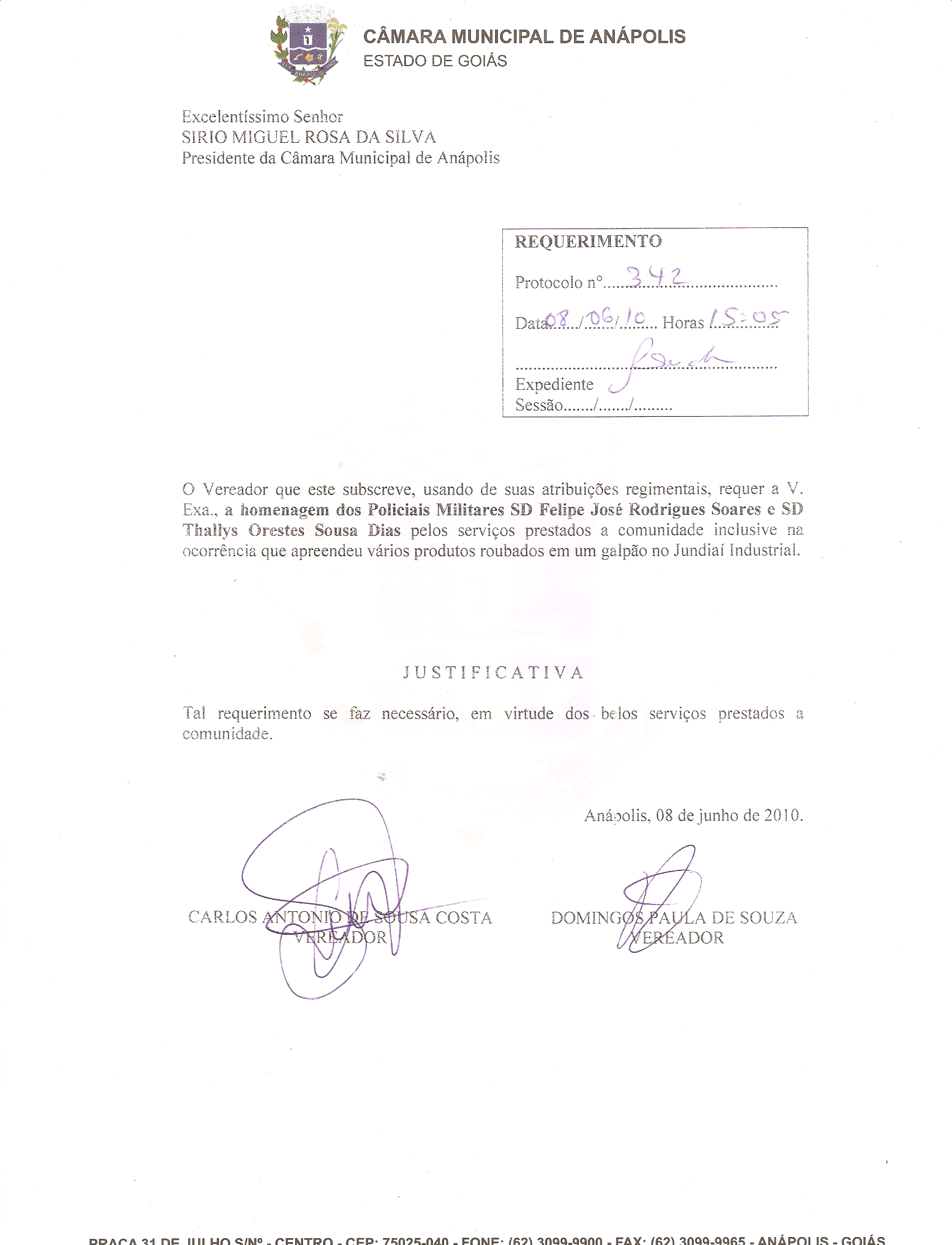 Ementa: O VEREADOR QUE ESTE SUBSCREVE, USANDO DE SUAS ATRIBUIÇÕES REGIMENTAIS, REQUER A V. EXA., A HOMENAGEM DOS POLICIAIS MILITARES SD.FELIPE JOSÉ RODRIGUES SOARES E SD. THALLYS ORESTES SOUSA DIAS PELOS SERVIÇOS PRESTADOS A COMUNIDADE INCLUSIVE NA OCORRÊNCIA QUE APREENDEU VÁRIOS PRODUTOS ROUBADOS EM UM GALPÃO NO JUNDIAI INDUSTRIAL.
