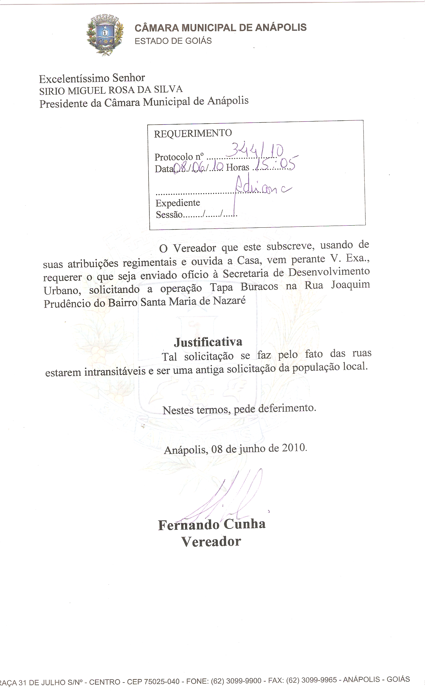 Ementa: O VEREADOR QUE ESTE SUBSCREVE, USANDO DE SUAS ATRIBUIÇÕES REGIMENTAIS E OUVIDA A CASA, VEM PERANTE V. EXA., REQUERER O QUE SEJA ENVIADO OFÍCIO Á SECRETARIA DE DESENVOLVIMENTO URBANO, SOLICITANDO A OPERAÇÃO TAPA BURACOS NA RUA JOAQUIM PRUDÊNCIO DO BAIRRO SANTA MARIA DE NAZARÉ.