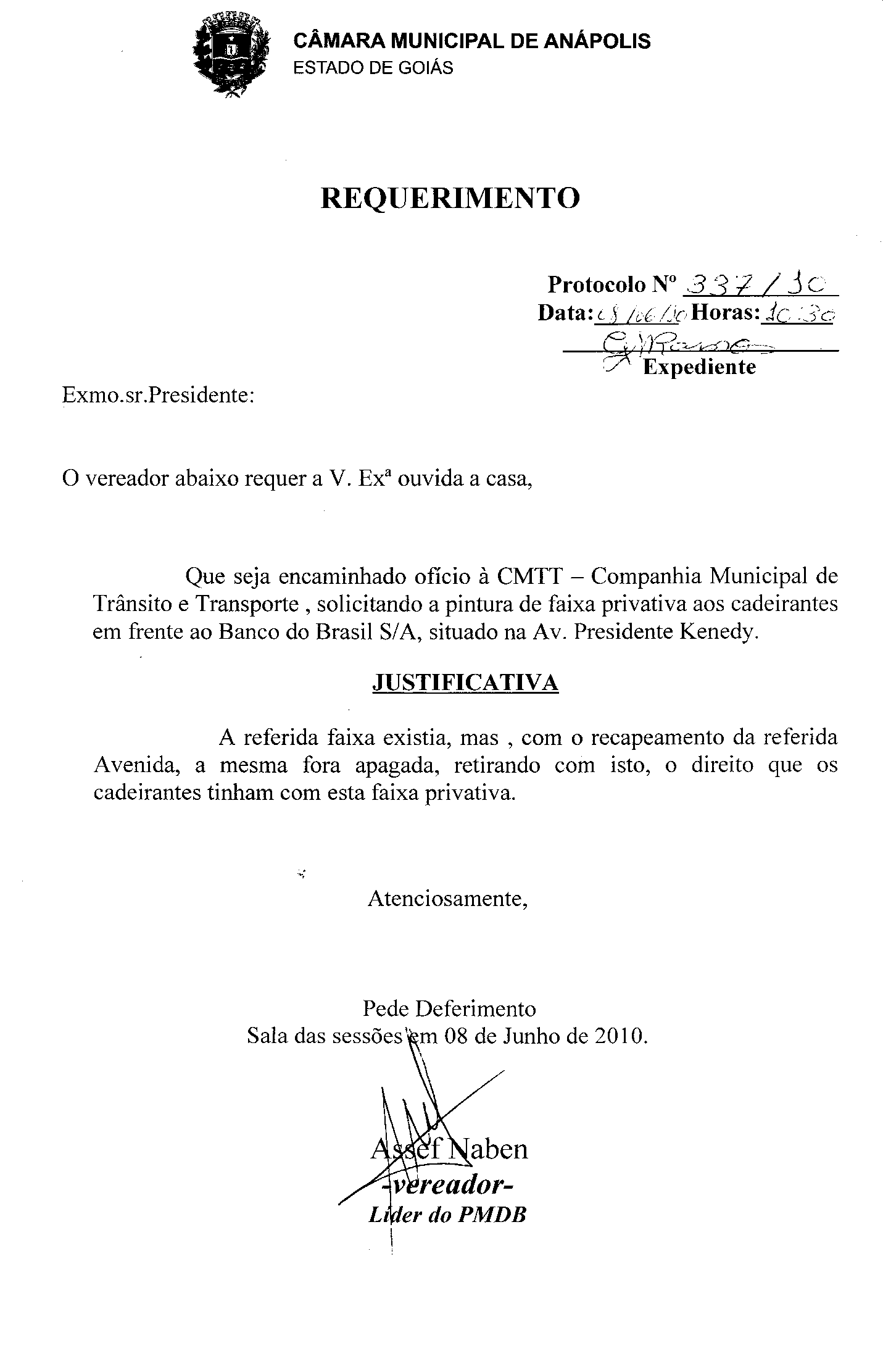 Ementa: O VEREADOR ABAIXO REQUER A V. EXA.,OUVIDA A CASA, QUE SEJA OFÍCIO Á CMTT- COMPANHIA MUNICIPAL DE TRÂNSITO E TRANSPORTE, SOLICITANDO A PINTURA DE FAIXA PRIVATIVA AOS CADEIRANTES EM FRENTE AO BANCO DO BRASIL S/A, SITUADO NA AV.PRESIDENTE KENEDY.