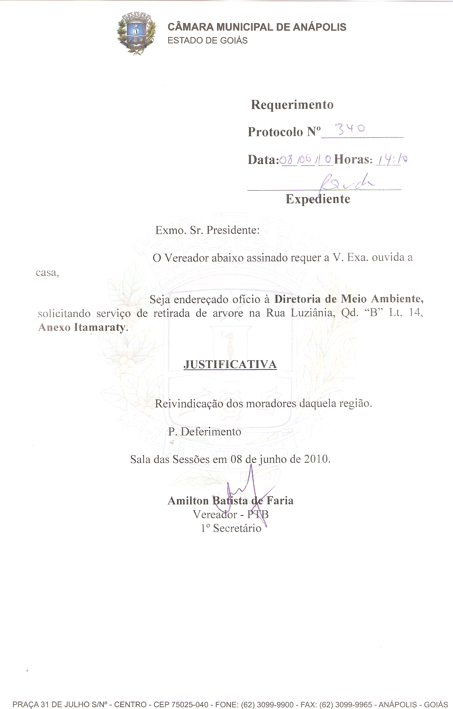 Ementa: O VEREADOR ABAIXO ASSINADO REQUER A V. EXA., OUVIDA A CASA, SEJA ENDERAÇADO OFÍCIO Á DIRETORIA DE MEIO AMBIENTE, SOLICITANDO SERVIÇI DE RETIRADA DE ÁRVORE NA RUA LUZIÂNIA, QD. B LT. 14, ANEXO ITAMARATY.