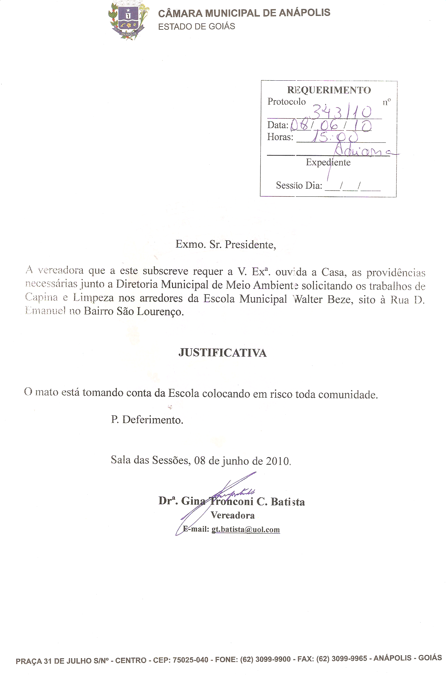 Ementa: A VEREADORA QUE ESTE SUBSCREVE REQUER A V. EXª. OUVIDA A CASA, AS PROVIDÊNCIAS NECESSÁRIAS JUNTO A DIRETORIA MUNICIPAL DE MEIO AMBIENTE SOLICITANDO OS TRABALHOS DE CAPINA E LIMPEZA NOS ARRETORES DA ESCOLA MUNICIPAL WALTER BEZE, SITO Á RUA D. EMANUEL NO BAIRRO SÃO LOURENÇO.