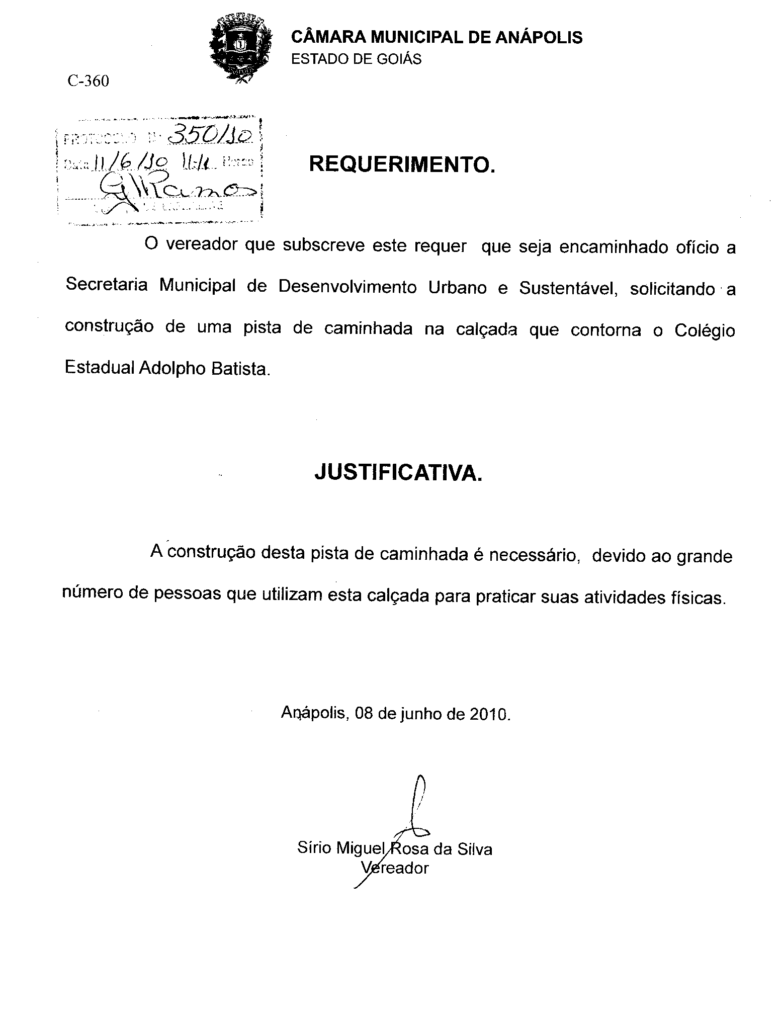 Ementa: O VEREADOR QUE SUBSCREVE ESTS REQUER QUE SEJA ENCAMINHADO OFÍCIO A SECRETARIA MUNICIPAL DE DESEVOLVIMENTO URBANO E SUSTENTÁVEL, SOLICITANDO A CONSTRUÇÃO DE PISTA DE CAMINHADA NA CALÇADA QUE CONTORNA O COLÉGIO ESTADUAL ADOLPHO BATISTA.