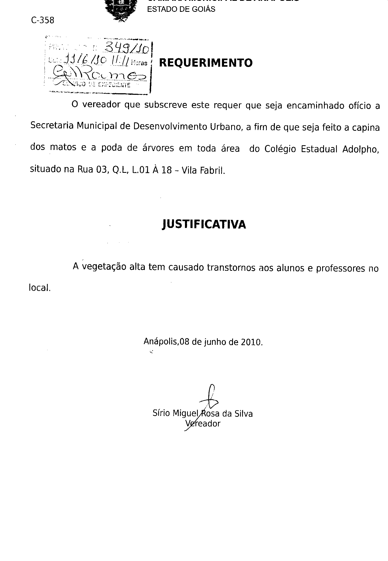 Ementa: O VEREADOR QUE SUBSCREVE ESTE REQUER QUE SEJA ENCAMINHADO OFÍCIO A SECRETARIA MUNICIPAL DE DESEVOLVIMENTO URBANO,A FIM DE QUE SEJA FEITO A CAPINA DOS MATOS E A PODA DE ÁRVORES EM TODA ÁREA DO COLÉGIO ESTATUAL ADOLPHO, SITUADO NA RUA 03, QD.L LT. 01 Á 18 -VILA FABRIL.
