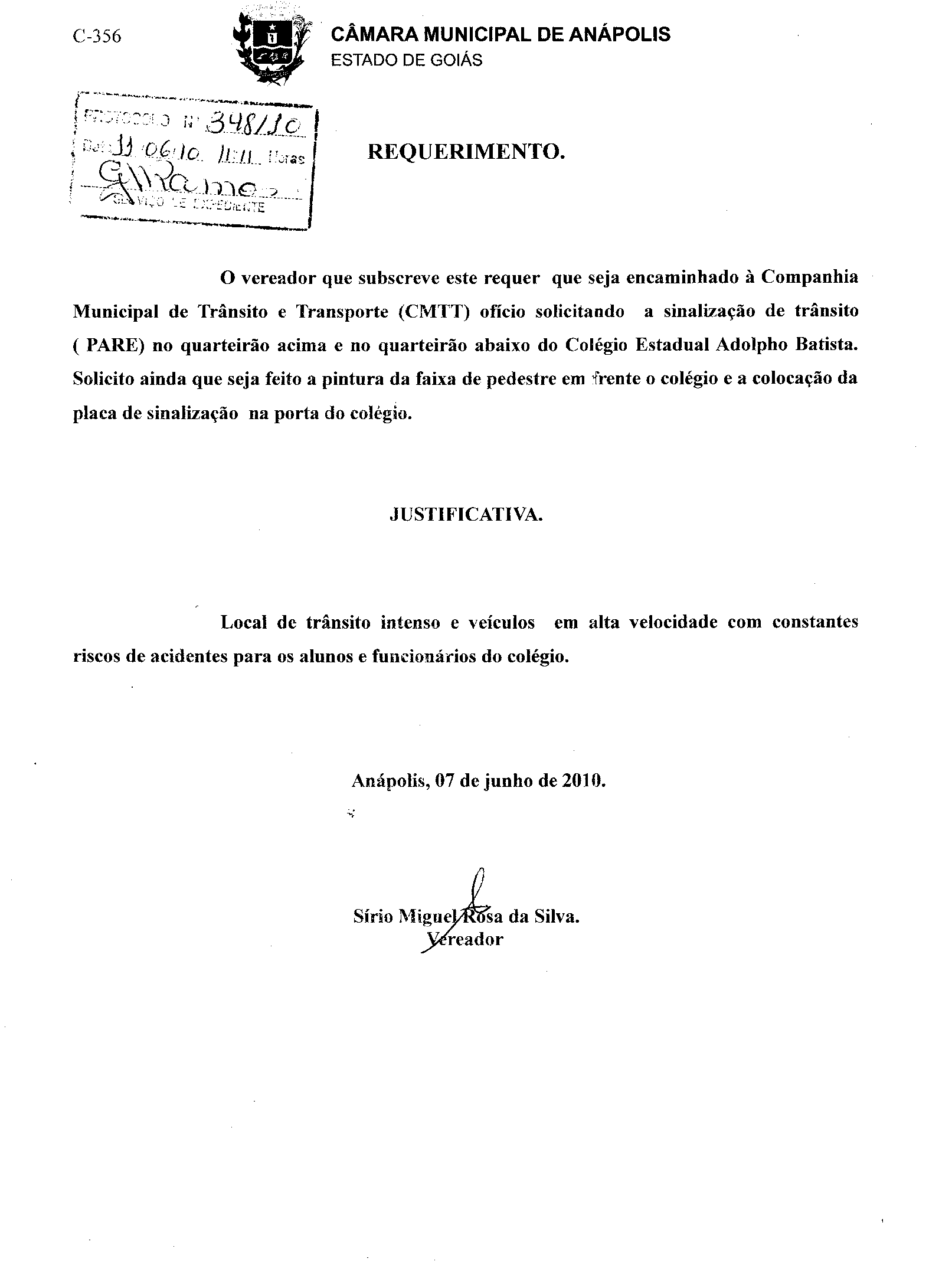 Ementa: O VEREADOR QUE SUBSCREVE ESTE REQUER QUE SEJA ENCAMINHADO Á COMPANHIA MUNICIPAL DE TRÂNSITO E TRANSPORTE (CMTT) OFÍCIO SOLICITANDO A SINALIZAÇÃO DE TRÂNSITO (PARE) NO QUARTEIRÃO ACIMA E NO QUARTEIRÃO ABAIXO DO COLÉGIO ESTADUAL ADOLPHO BATISTA. SOLICITO AINDA QUE SEJA FEITO PINTURA DA FAIXA DE PEDESTRE EM FRENTE O COLÉGIO E A COLOCAÇÃO DA PLACA DE SINALIZAÇÃO NA PORTA DO COLÉGIO.
