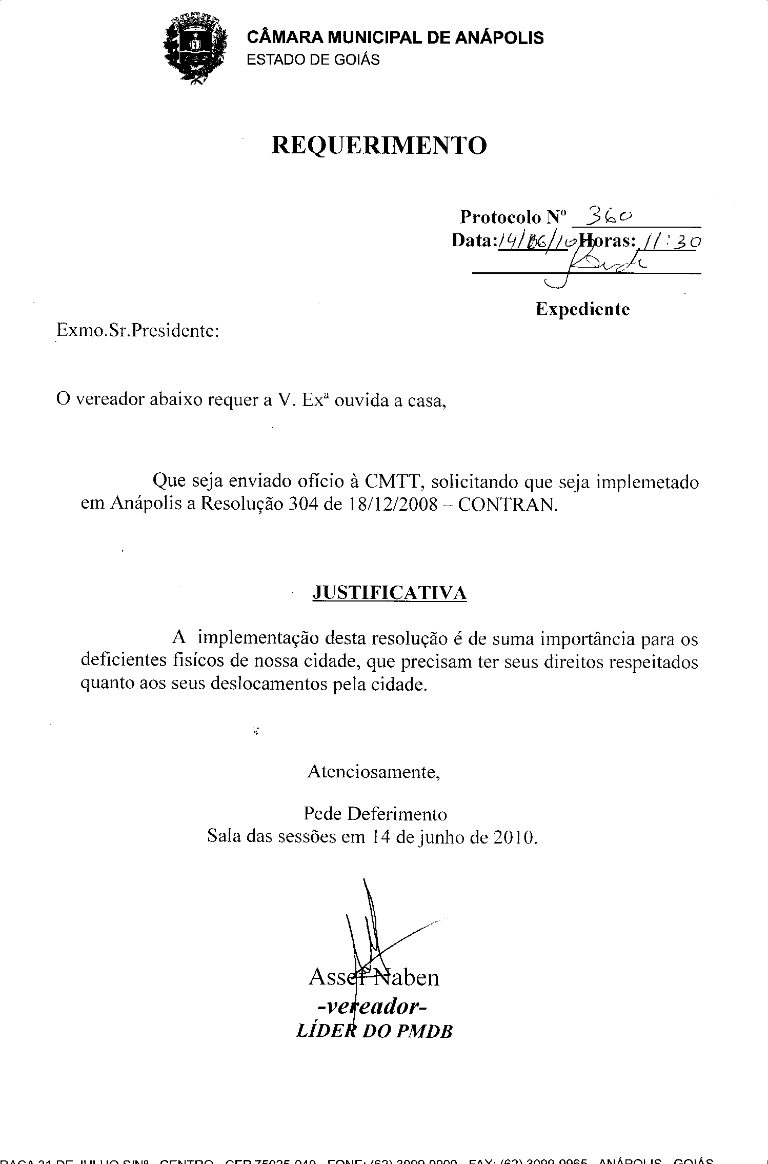 Ementa: O VEREADOR ABAIXO REQUER A V. EXA., OUVIDA A CASA, QUE SEJA ENVIADO Á CMTT, SOLICITANDO QUE SEJA IMPLEMENTADO EM ANÁPOLIS A RESOLUÇÃO 304 DE 18/12/2008 -CONTRAN.