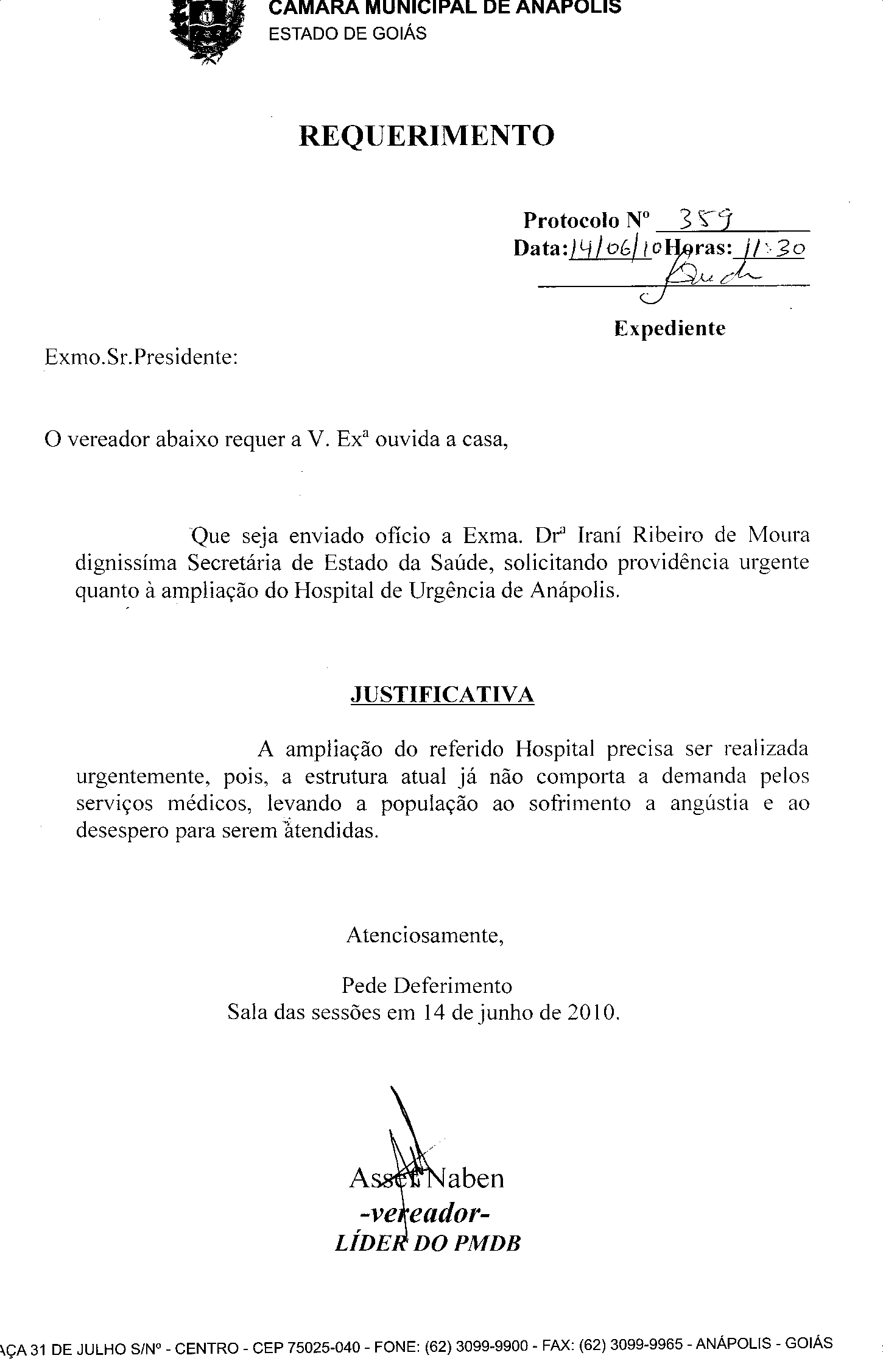 Ementa: O VEREADOR ABAIXO REQUER A V. EXA., OUVIDA A CASA, QUE SEJA ENVIADO OFÍCIO A EXMA. DRª IRANÍ RIBEIRO DE MOURA DIGNISSÍMA SECRETÁRIADE ESTADO DA SAÚDE, SOLICITANDO PROVIDÊNCIA URGENTE QUANTO Á AMPLIAÇÃO DO HOSPITAL DE URGÊNCIA DE ANÁPOLIS.