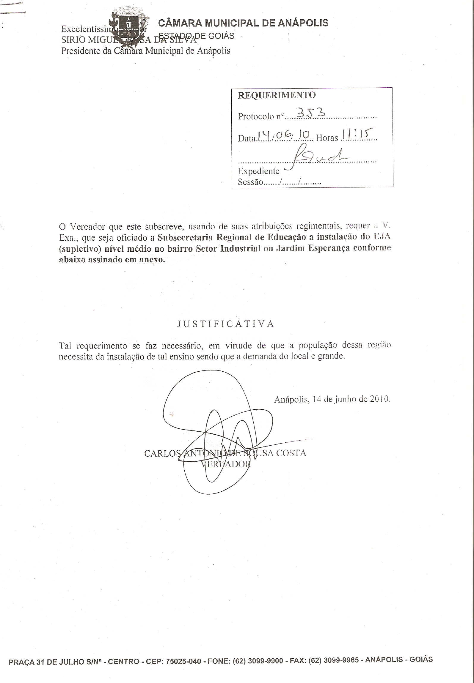 Ementa: O VEREADOR QUE ESTE SUBSCREVE, USANDO DE SUAS ATRIBUIÇÕES REGIMENTAIS, REQUER A V. EXA., QUE SEJA OFÍCIADO A SUBSCRETARIA REGIONAL DE EDUCAÇÃO A INTALAÇÃO DO EJA (SUPLETIVO) NÍVEL MÉDIO NO BAIRRO SETOR INDUSTRIAL OU JARDIM ESPERANÇA CONFORME ABAIXO ASSINADO EM ANEXO.