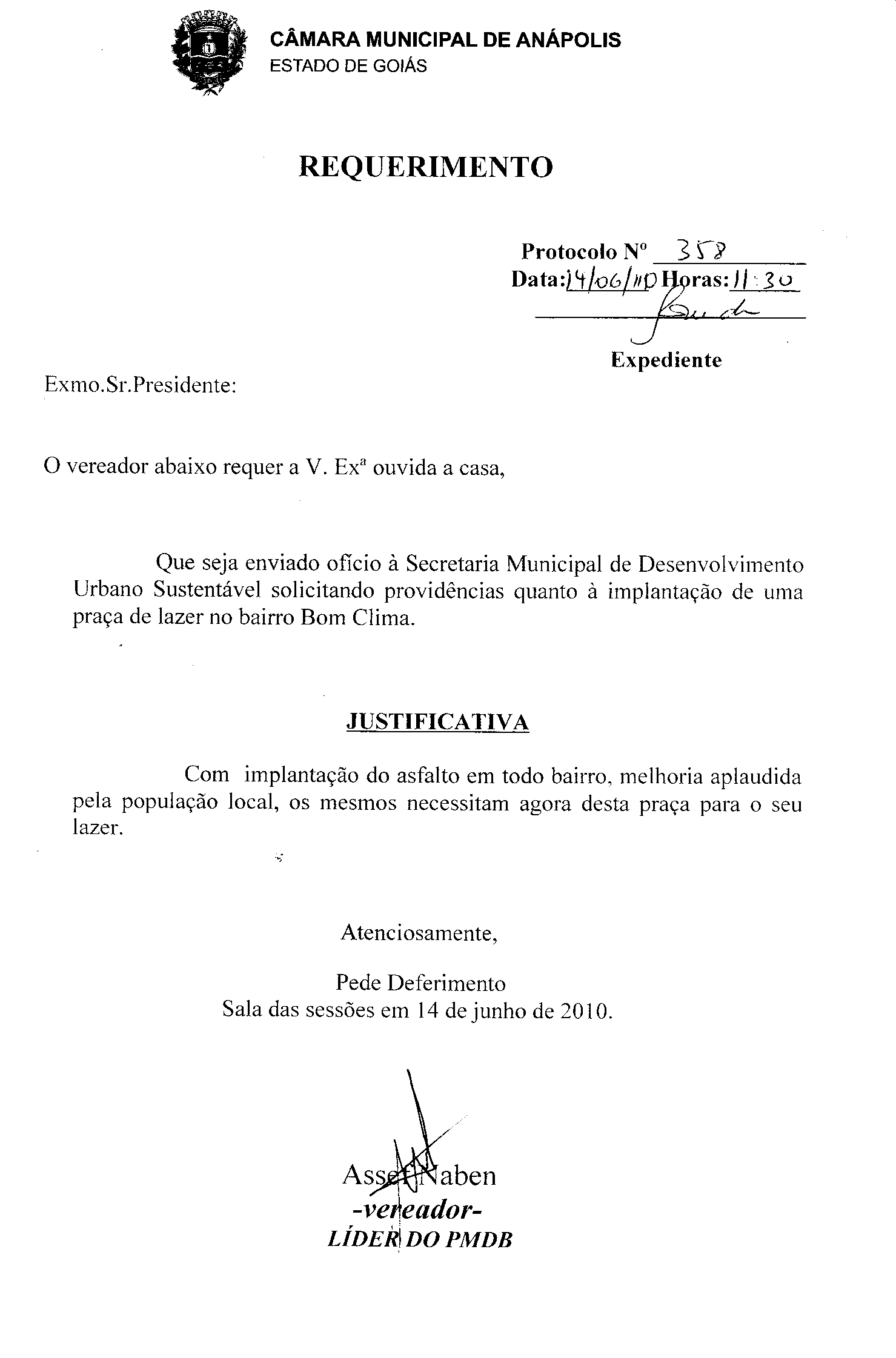 Ementa: O VEREADOR ABAIXO REQUER A V.EXA., OUVIDAA CASA,QUE SEJA ENVIADO OFÍCIO Á SECRETARIA MUNICIPAL DE DESENVOLVIMENTO URBANO SUSTENTÁVEL SOLICITANDO PROVIDÊNCIAS QUANTO Á IMPLANTAÇÃO DE UMA PRAÇA DE LAZER NO BAIRRO BOM CLIMA.