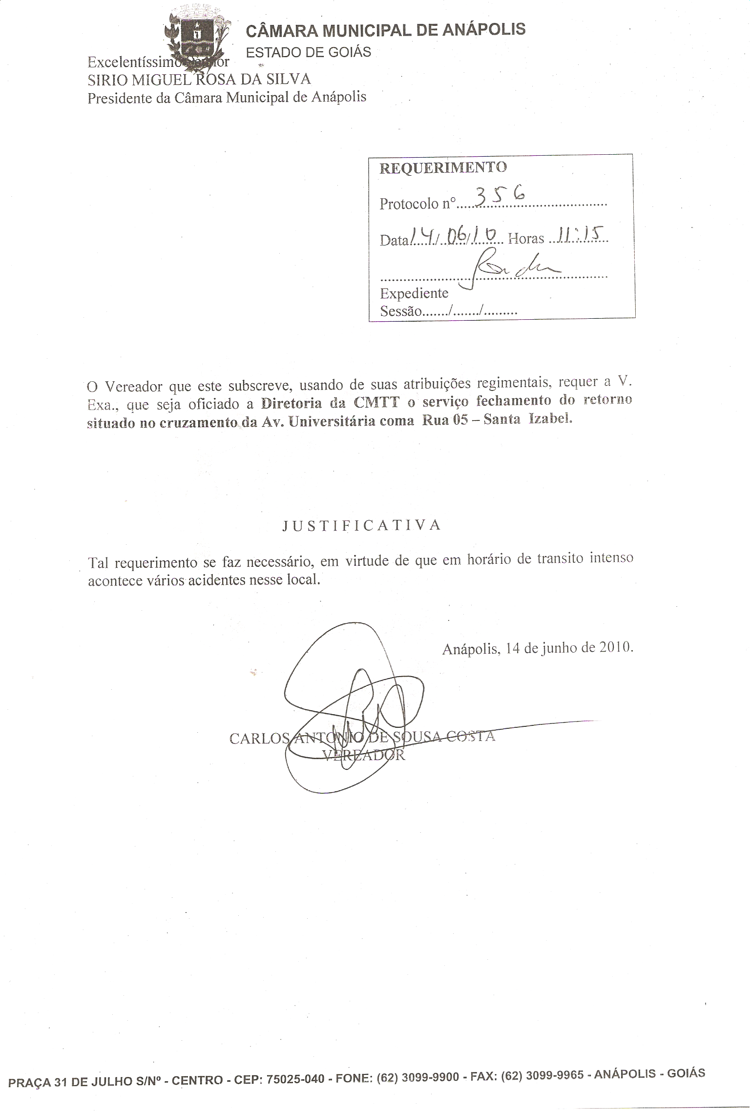 Ementa: O VEREADOR QUE ESTE SUBSCREVE, USANDO DE SUAS ATRIBUIÇÕES, REQUER A V. EXA., QUE SEJA OFÍCIADO A DIRETORIA DA CMTT O SERVIÇO FECHAMENTO DO RETORNO SITUADO NO CRUZAMENTO DA AV. UNIVERSITÁRIA COM A RUA 05-SANTA IZABEL.