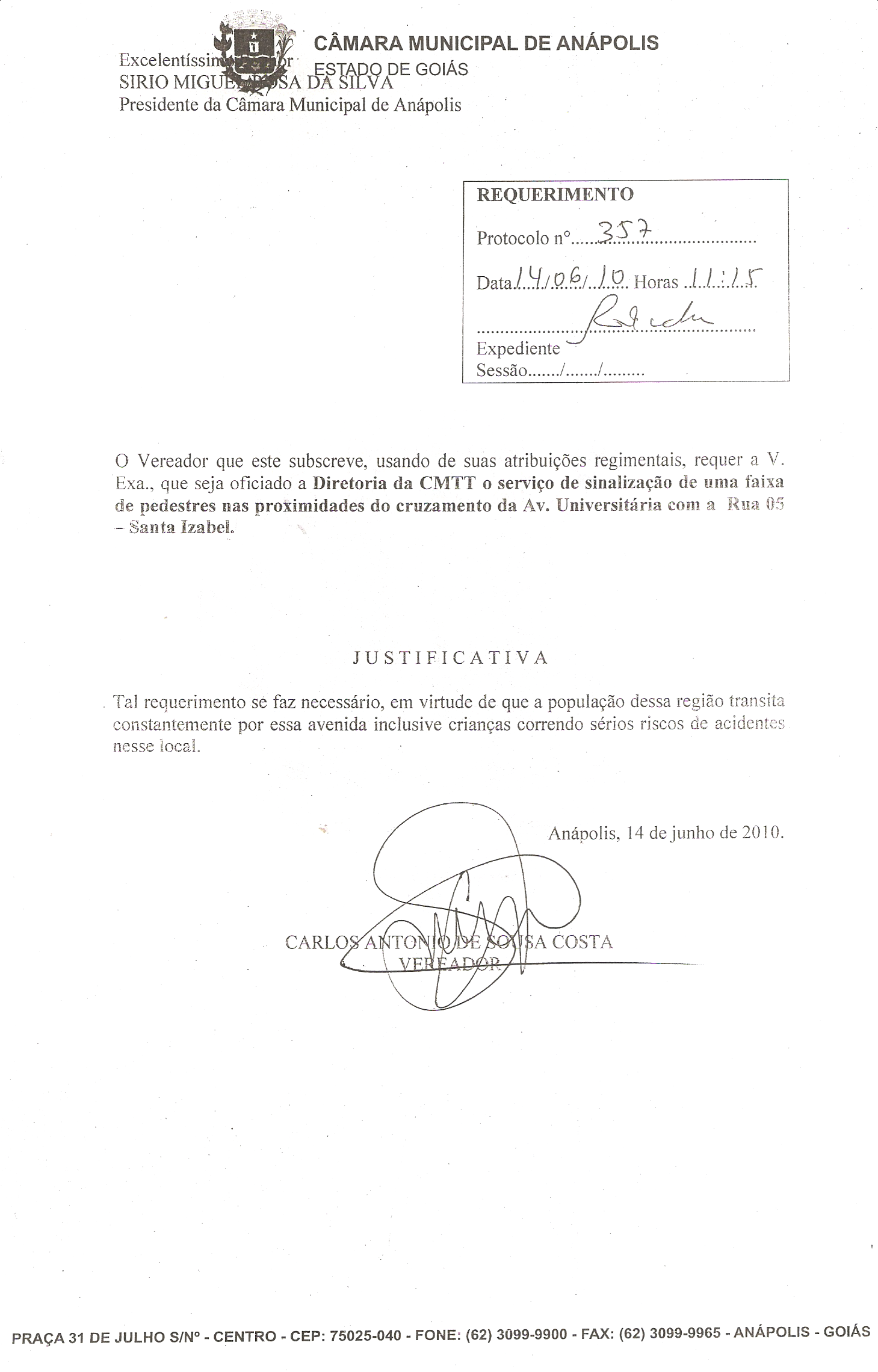 Ementa: O VEREADOR QUE ESTE SUBSCREVE, USANDO DE SUAS ATIBRUIÇÕES REGIMENTAIS, REQUER A V. EXA., QUE SEJA OFÍCIADO A DIRETORIA DE CMTTO SERVIÇO DE SINALIZAÇÃO DE UMA FAIXA DE PEDESTRES NAS PROXIMIDADE DO CRUZAMENTO DA AV. UNIVERSITÁRIA COM A RUA 05- SANTA IZABEL.