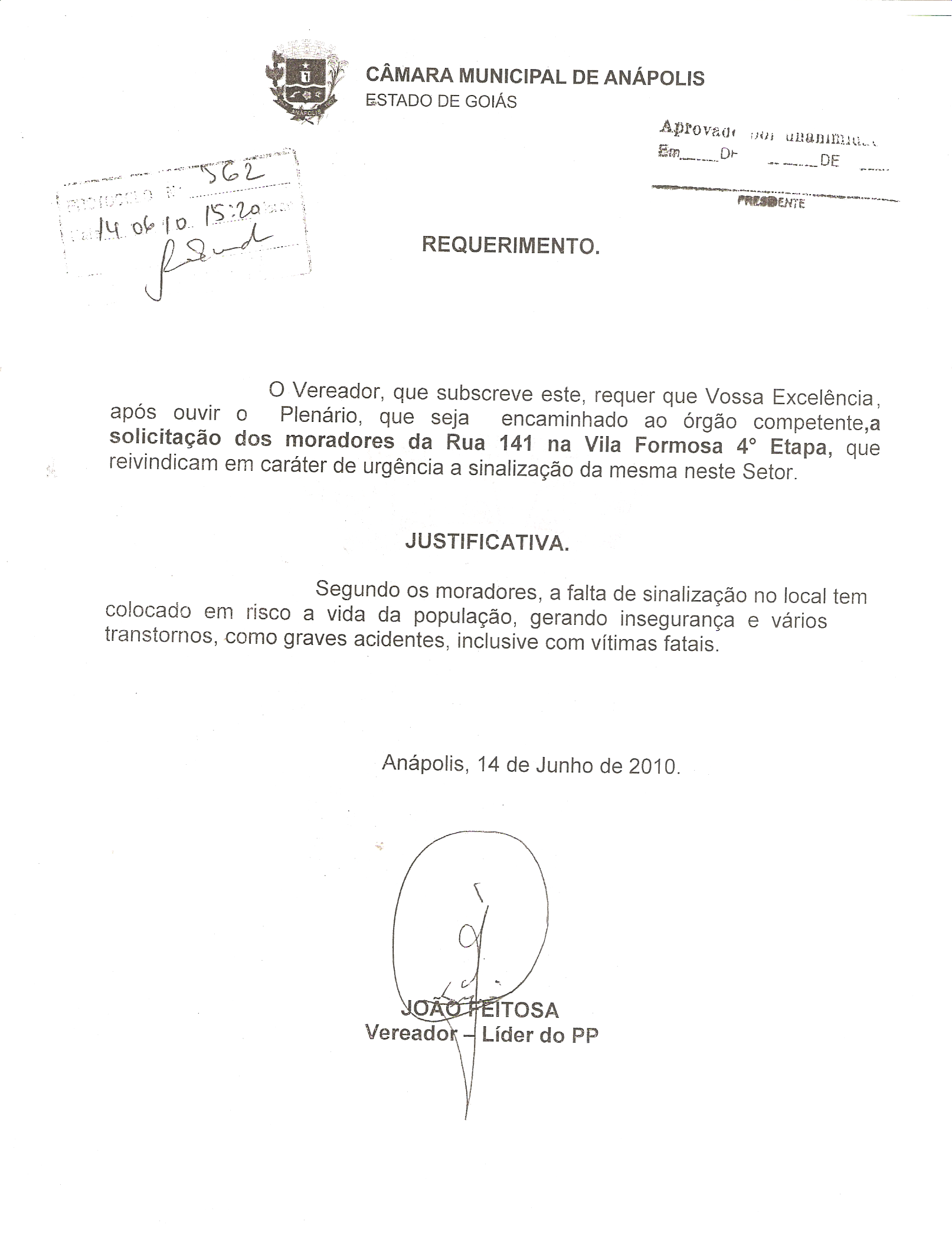 Ementa: O VEREADOR, QUE SUBSCREVE ESTE, REQUER VOSSA EXCELÊNCIA, APÓS OUVIR O PLENÁRIO, QUE SEJA ENCAMINHADO AO ÓRGÃO COMPETENTE, A SOLICITAÇÃO DOS MORADORES DA RUA 141 NA VILA FORMOSA 4º ETAPA, QUE REIVINDICAM EM CARÁTER DE URGÊNCIA A SINALIZAÇÃO DA MESMA NESTE SETOR.