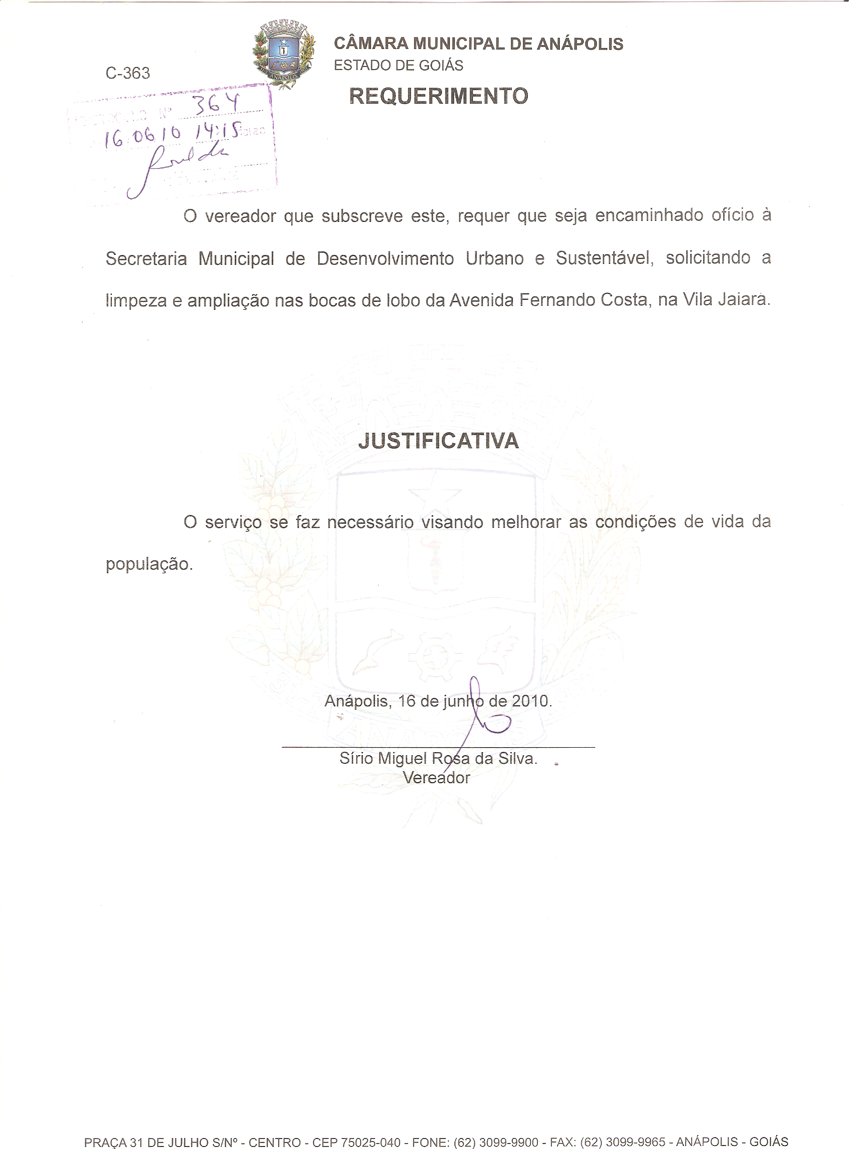 Ementa: O VEREADOR QUE SUBSCREVE ESTE, REQUER QUE SEJA ENCAMINHADO OFÍCIO Á SECRETARIA MUNICIPAL DE DESENVOLVIMENTO URBANO E SUSTENTÁVEL, SOLICITANDO A LIMPEZA E AMPLIAÇÃO NAS BOCAS DE LOBO DA AVENIDA FERNANDO COSTA, NA VILA JAIARA.
