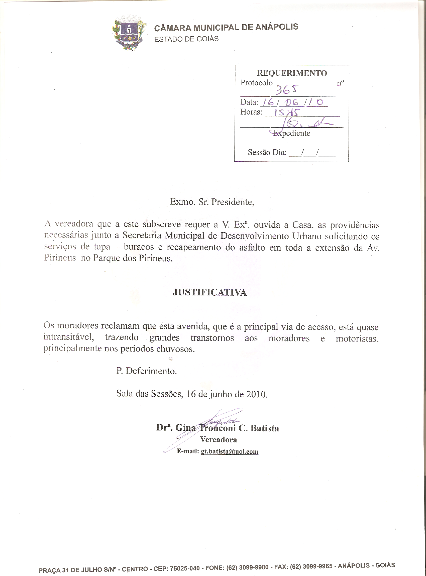 Ementa: A VEREADORA QUE A ESTE SUBSCREVE REQUER A V.EXª. OUVIDA CASA, AS PROVIDÊNCIAS NECESSÁRIAS JUNTO A SECRETÁRIA MUNICIPAL DE DESENVOLVIMENTO URBANO SOLICITANDO OS SERVIÇOS DE TAPA - BURACOS E RECAPEAMENTO DO ASFLATO EM TODA A EXTENSÃO DA AV. PIRINEUS NO PARQUE PIRINEUS.