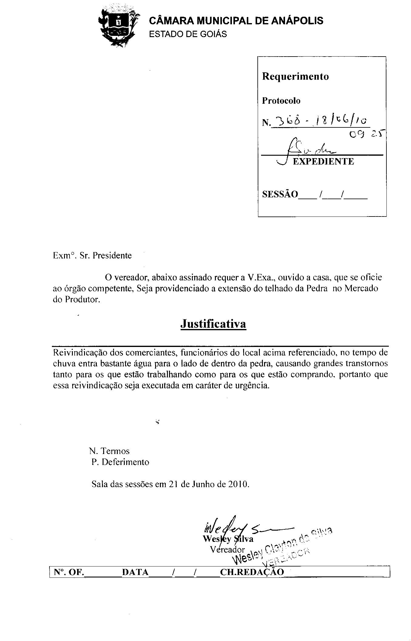 Ementa: O VEREADOR, ABAIXO ASSINADO REQUER A V. EXA., OUVIDO A CASA,QUE SE OFÍCIO AO ÓRGÃO COMPETENTE,SEJA PROVIDENCIADO A EXTENSÃO DO TELHADO DA PEDRA NO MERCADO DO PROTUDOR.