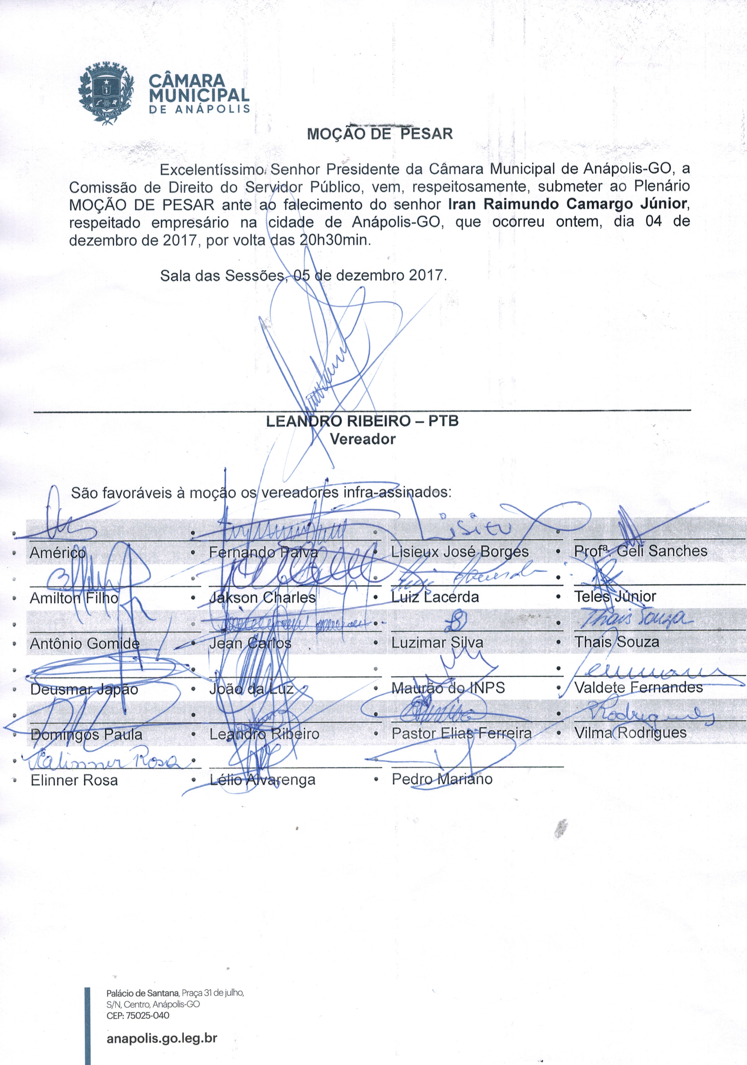 MOÇÃO DE PESAR ANTE AO FALECIDO SENHOR IRAN RAIMUNDO CAMARGO JR. - - |