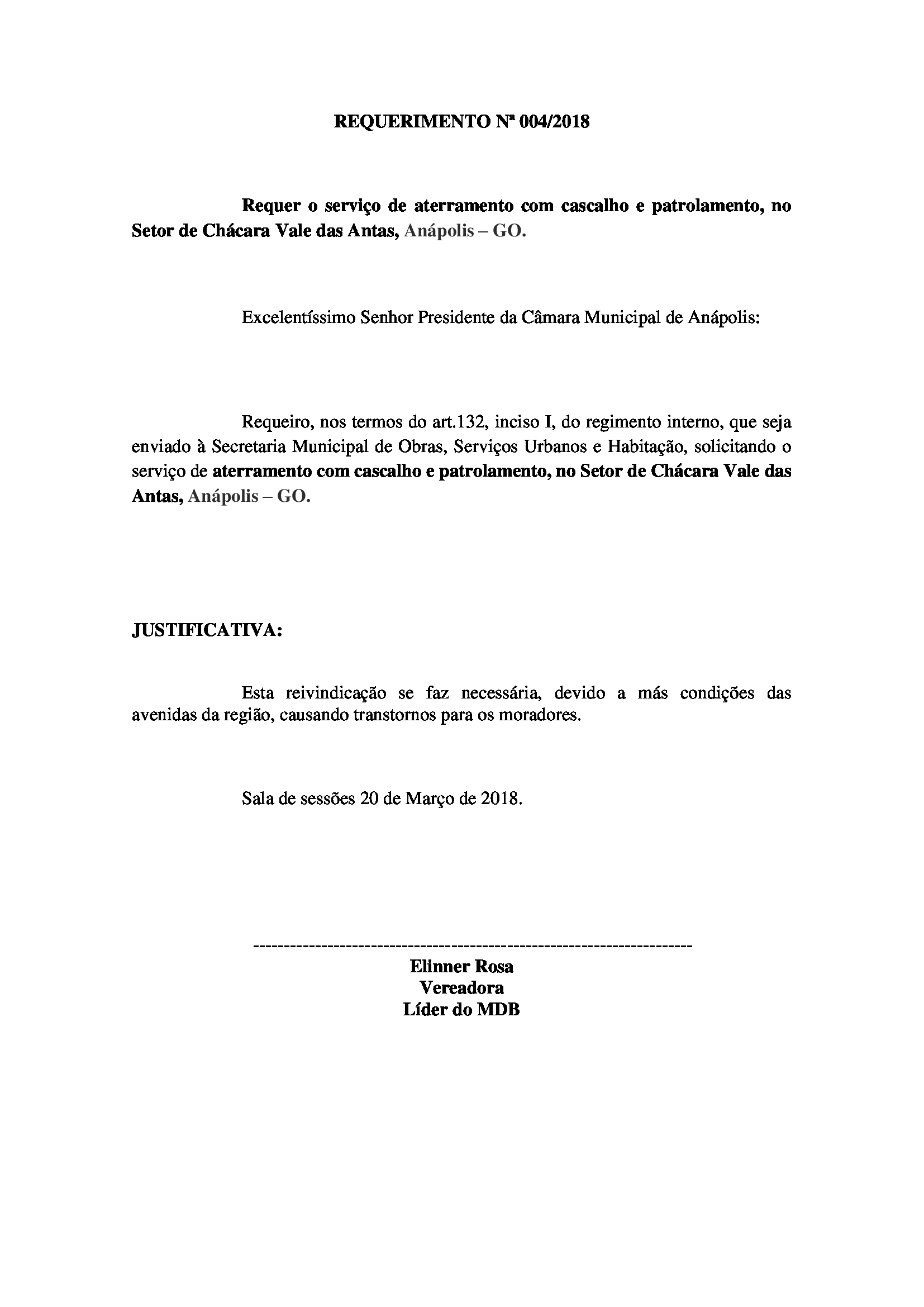 REQUER O SERVIÇO DE ATERRAMENTO COM CASCALHO E PATROLAMENTO, NO SETOR DE CHÁCARA VALE DAS ANTAS, ANÁPOLIS-GO. - - |